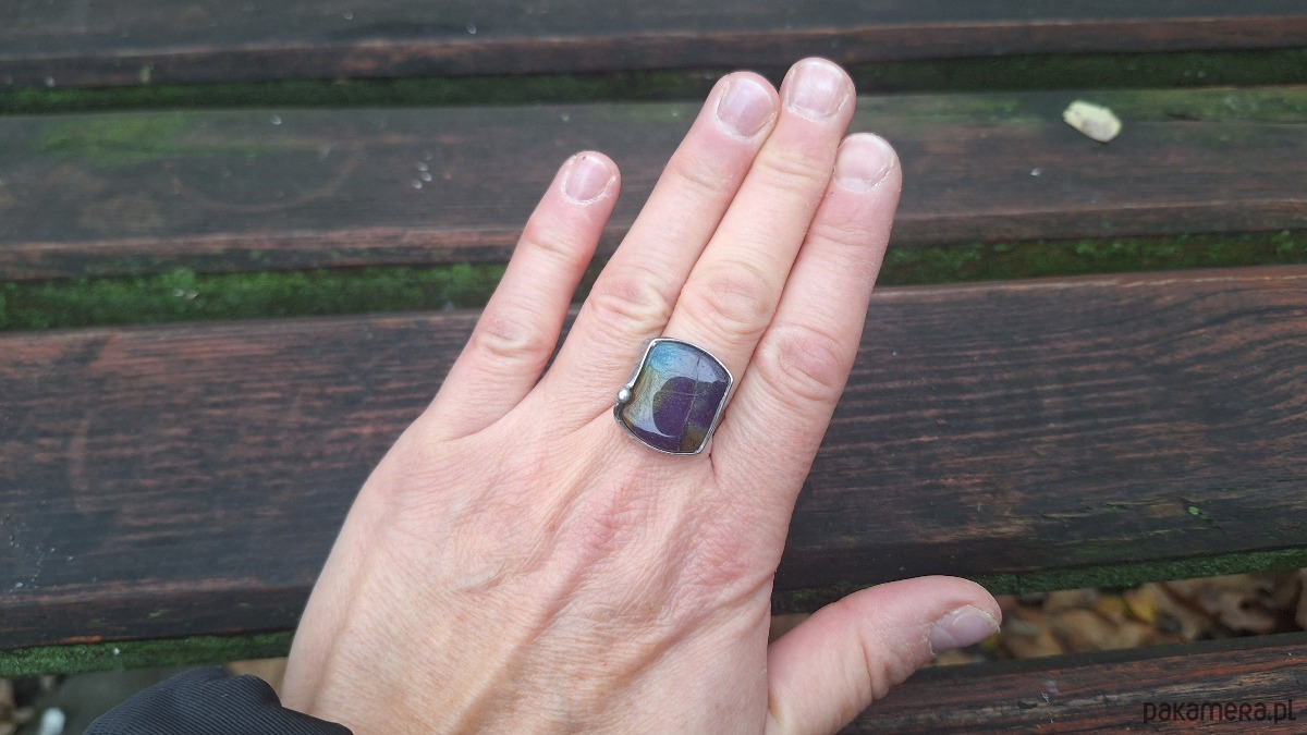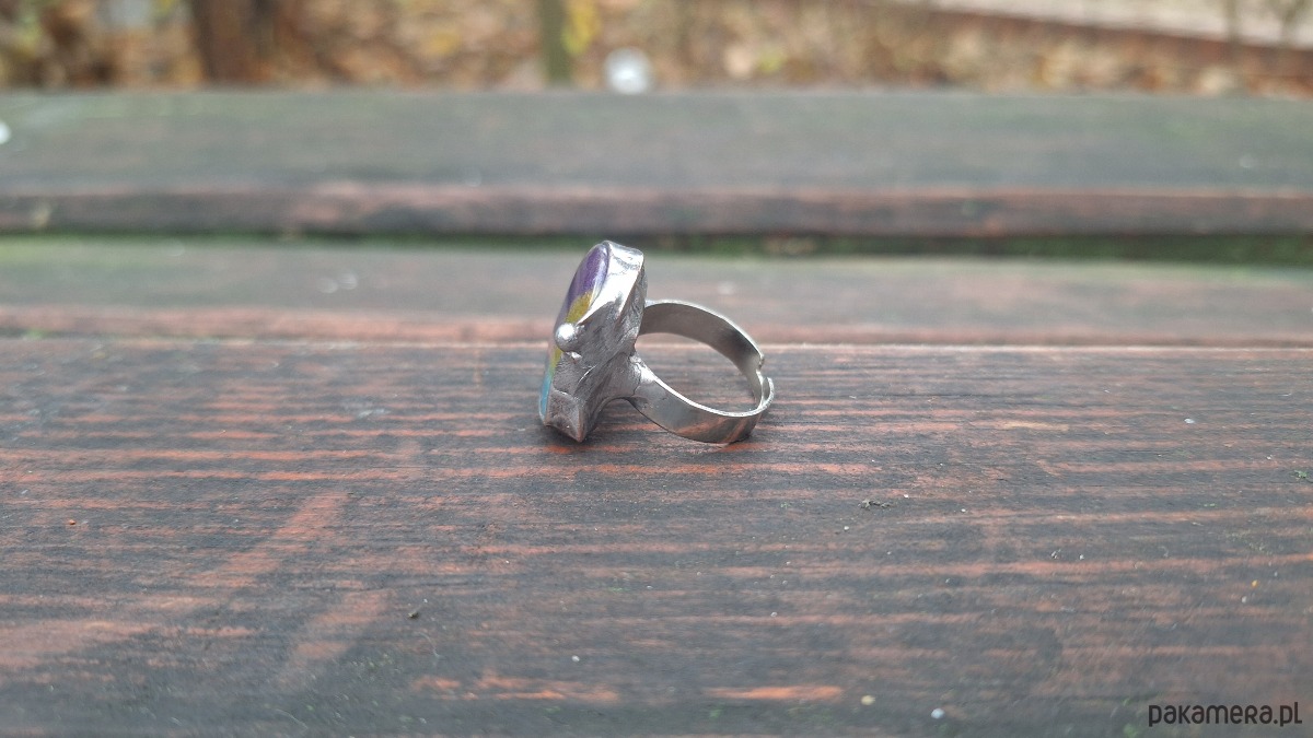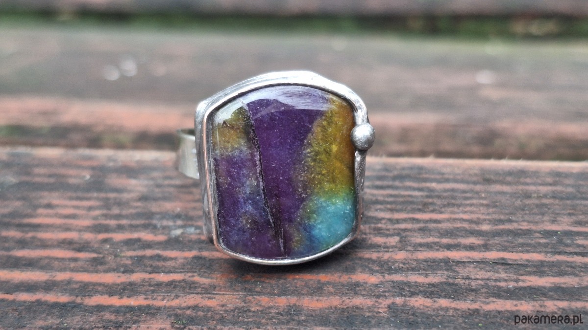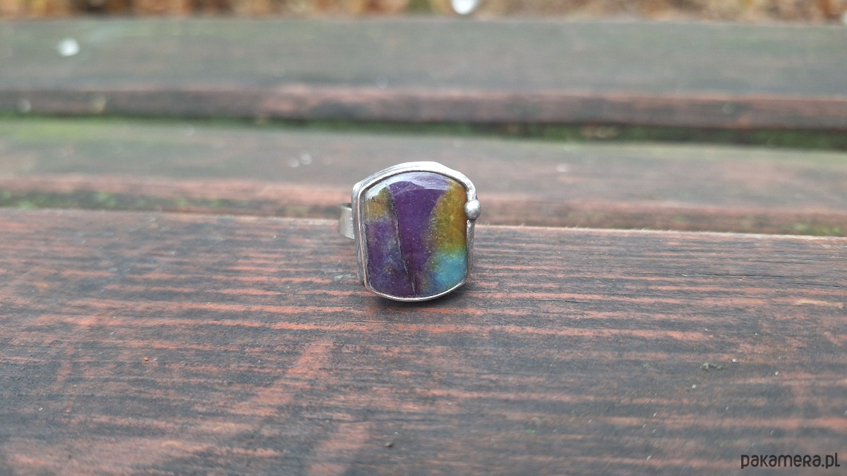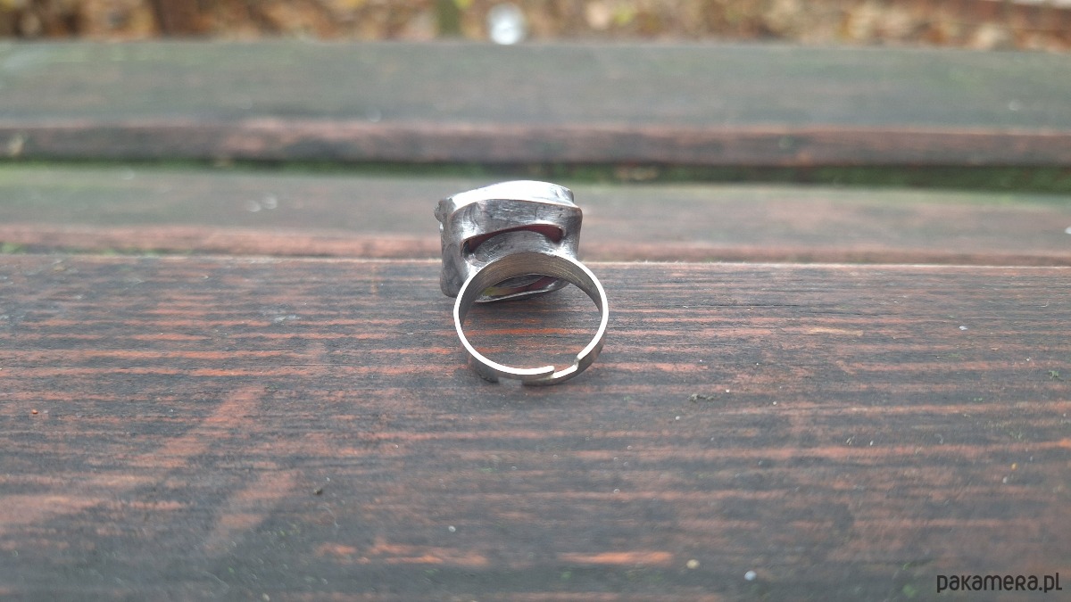 Pierścionek wykonany z miedzi, cyny i jaspisu. Wymiary ok. 1.8 na 1.6 cm. Regulowany. Nie jest ciężki.