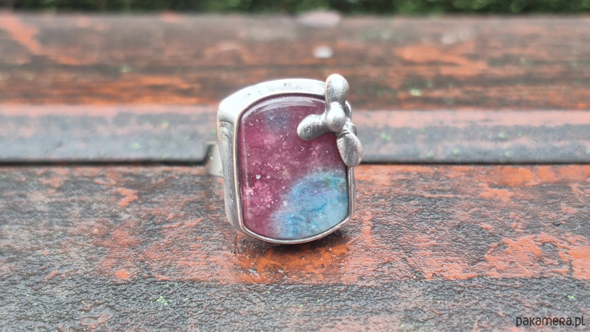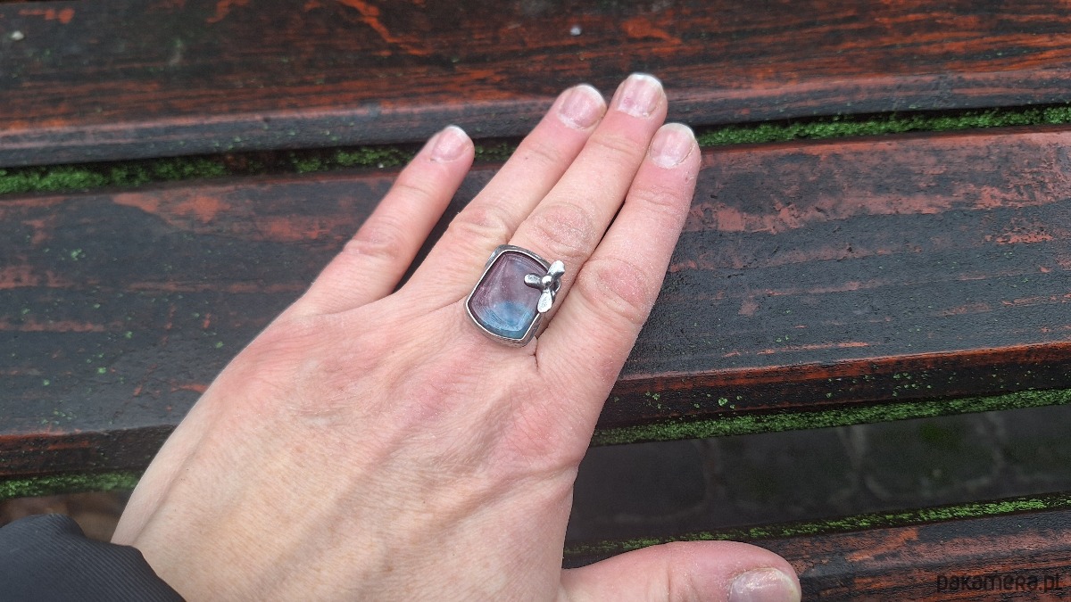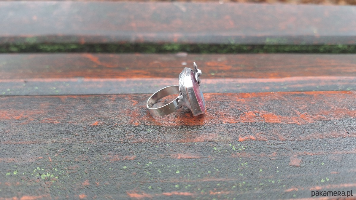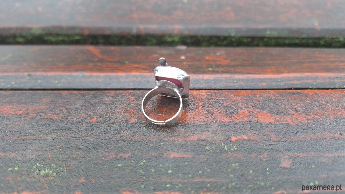 Pierścionek wykonany z miedzi, cyny i jaspisu. Wymiary ok. 2 na 1.7 cm. Regulowany. Nie jest ciężki.