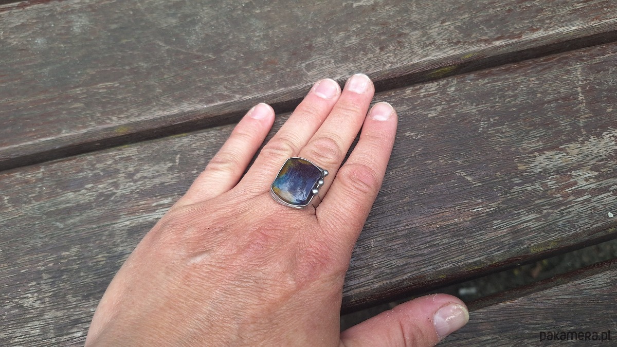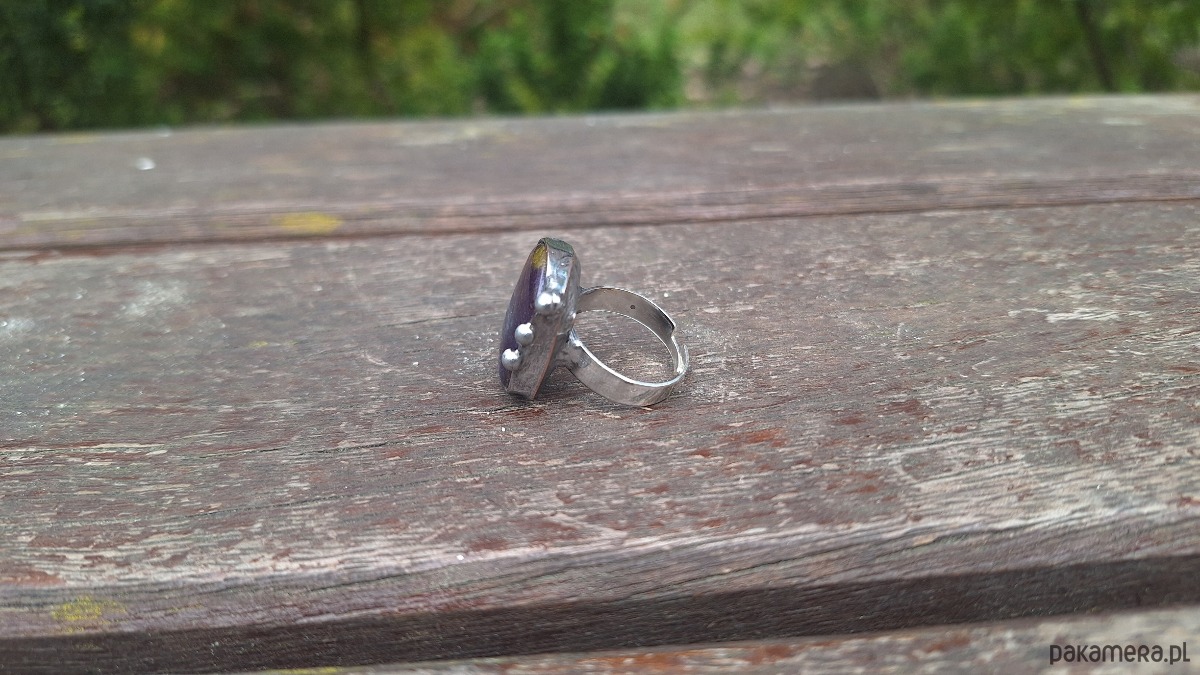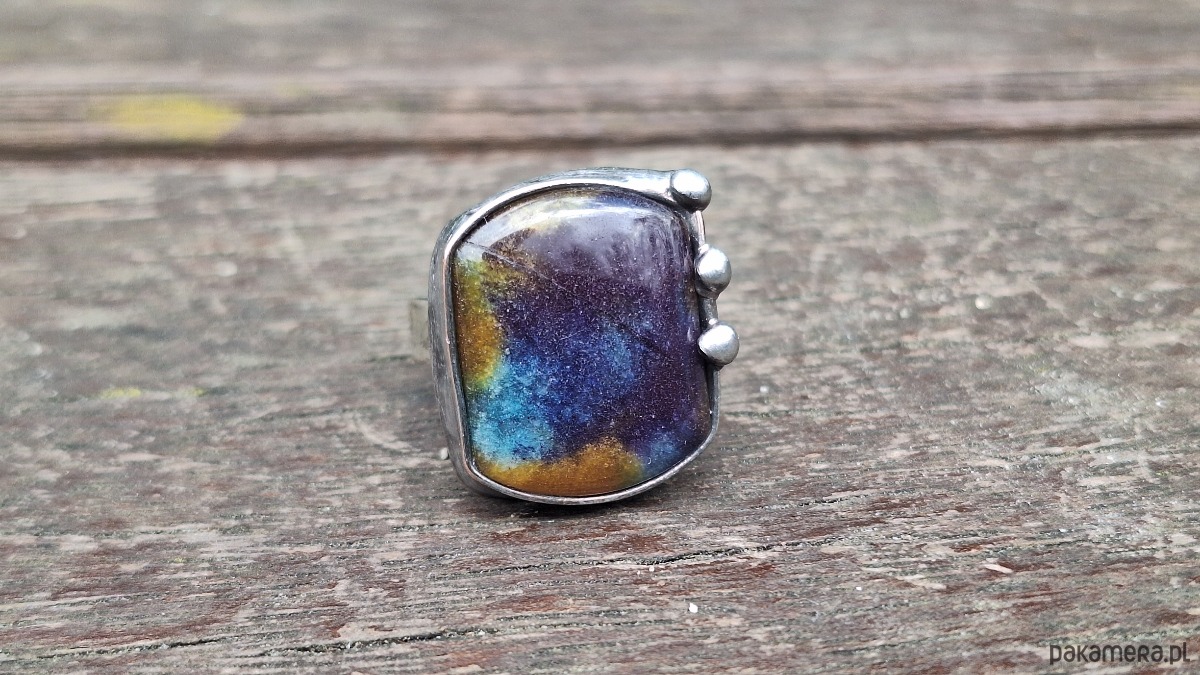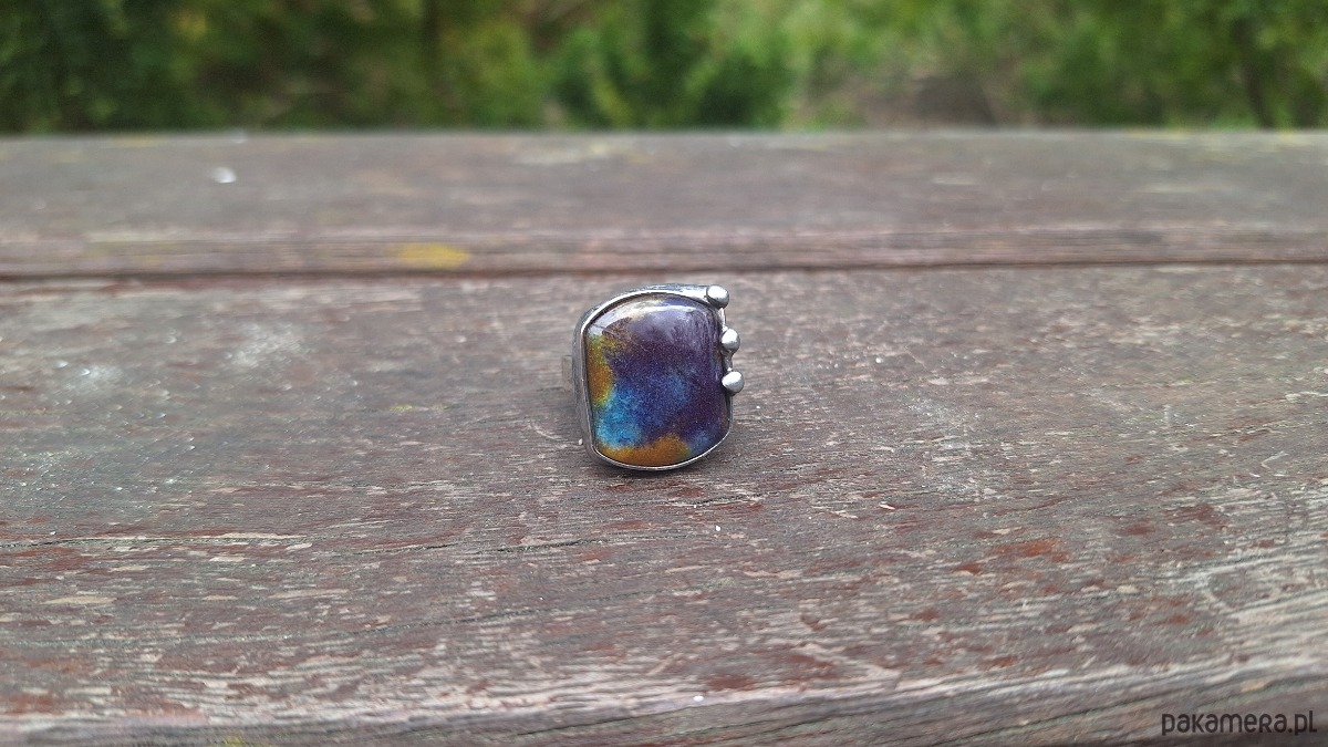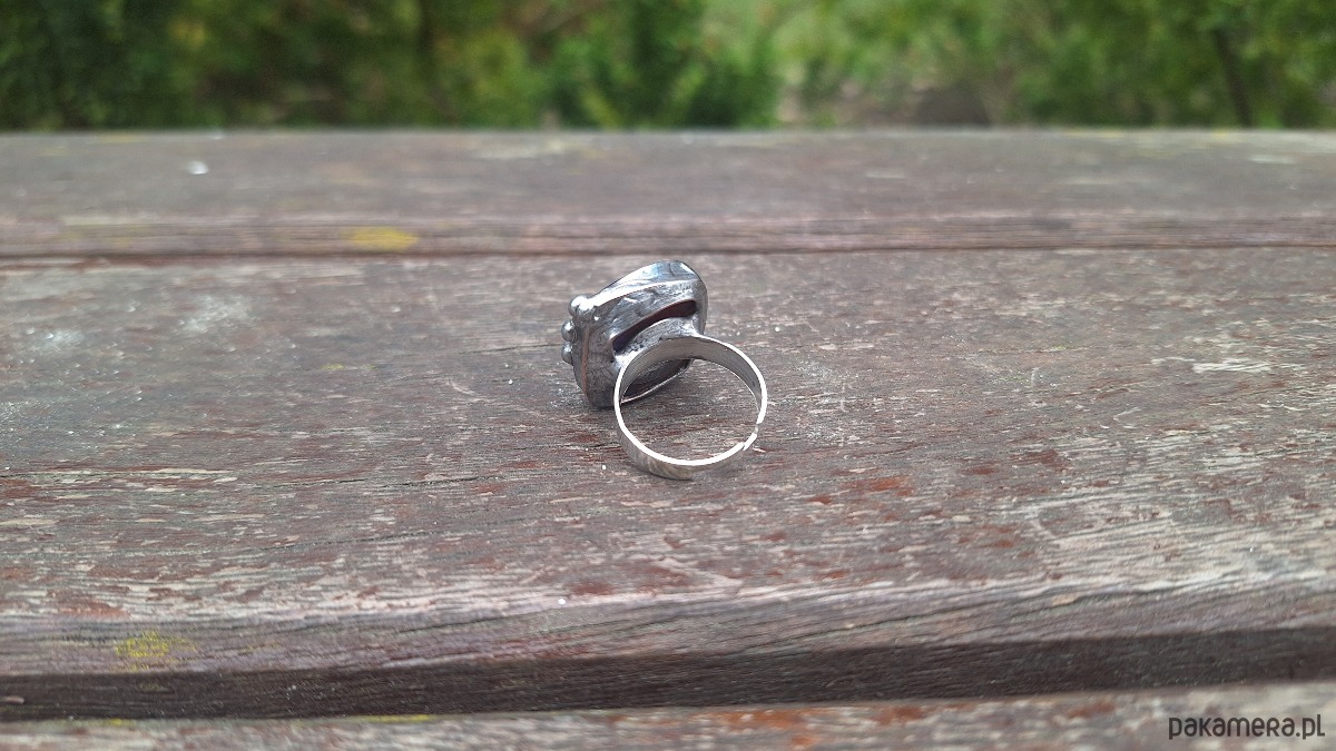 Pierścionek wykonany z miedzi, cyny i jaspisu. Wymiary ok. 2 na 1.7 cm. Regulowany. Nie jest ciężki.