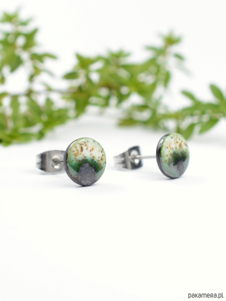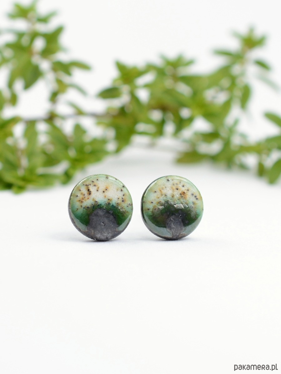 Kolczyki to małe kółeczka poszkliwione mieszanką szkliw w kolorystyce: zieleń, grafit, beż, brąz. Elementy o średnicy 8 mm i grubości 1,5 mm są szkliwione jednostronnie. Elementy ceramiczne zostały przeze mnie dopracowane w najmniejszym szczególe-boczne krawędzie poszkliwiłam w kolorze denim :))) Kolczyki są solidnie umocowane na sztyftach ze stali chirurgicznej - antyalergiczna w kolorze oksydowanego srebra. Bardzo serdecznie polecam!! Wysyłam w ozdobnym pudełeczku.