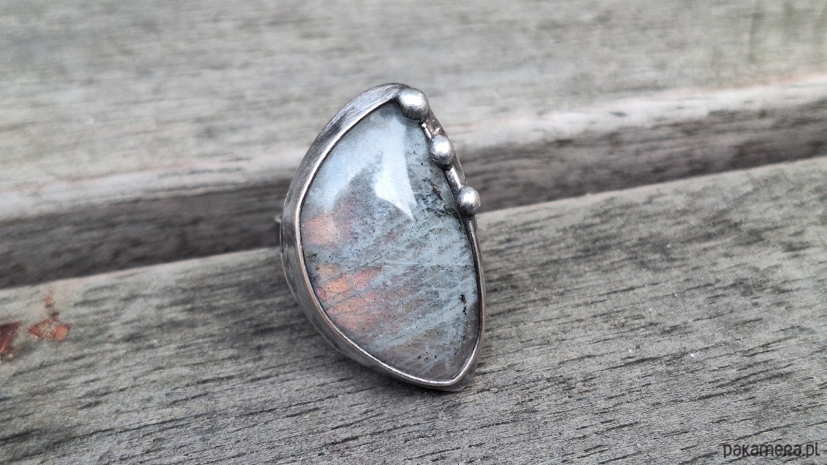 Pierścionek wykonany z miedzi, cyny i labradorytu. Wymiary ok. 3 na 2 cm. Regulowany. Nie jest ciężki.