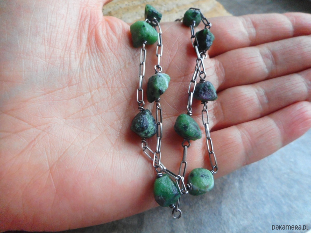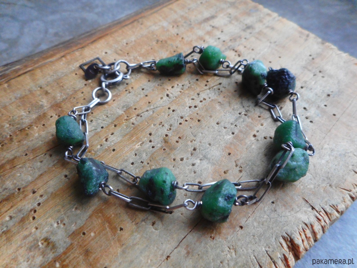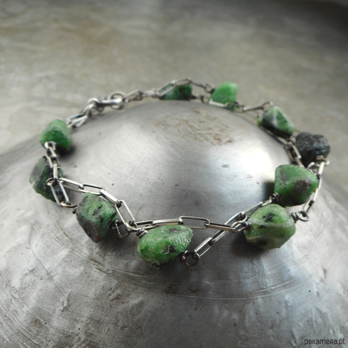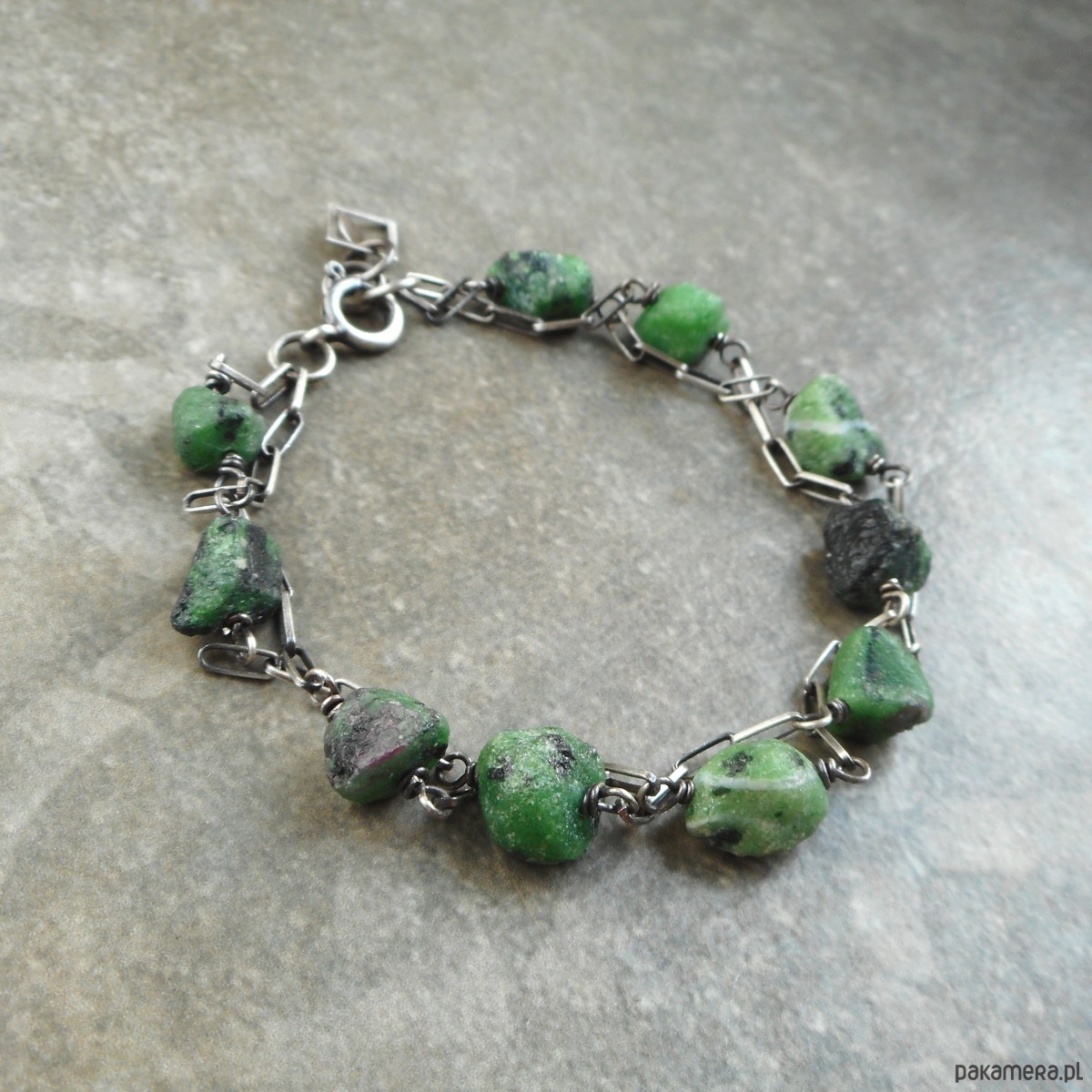 Wyjątkowa bransoletka z kamieni naturalnych i szlachetnego srebra; surowego stylu biżuterii nadają nieszlifowane, nieregularne bryłki zoisytu z rubinem. Do kompletu polecam kolczyki dostępne w mojej galerii.