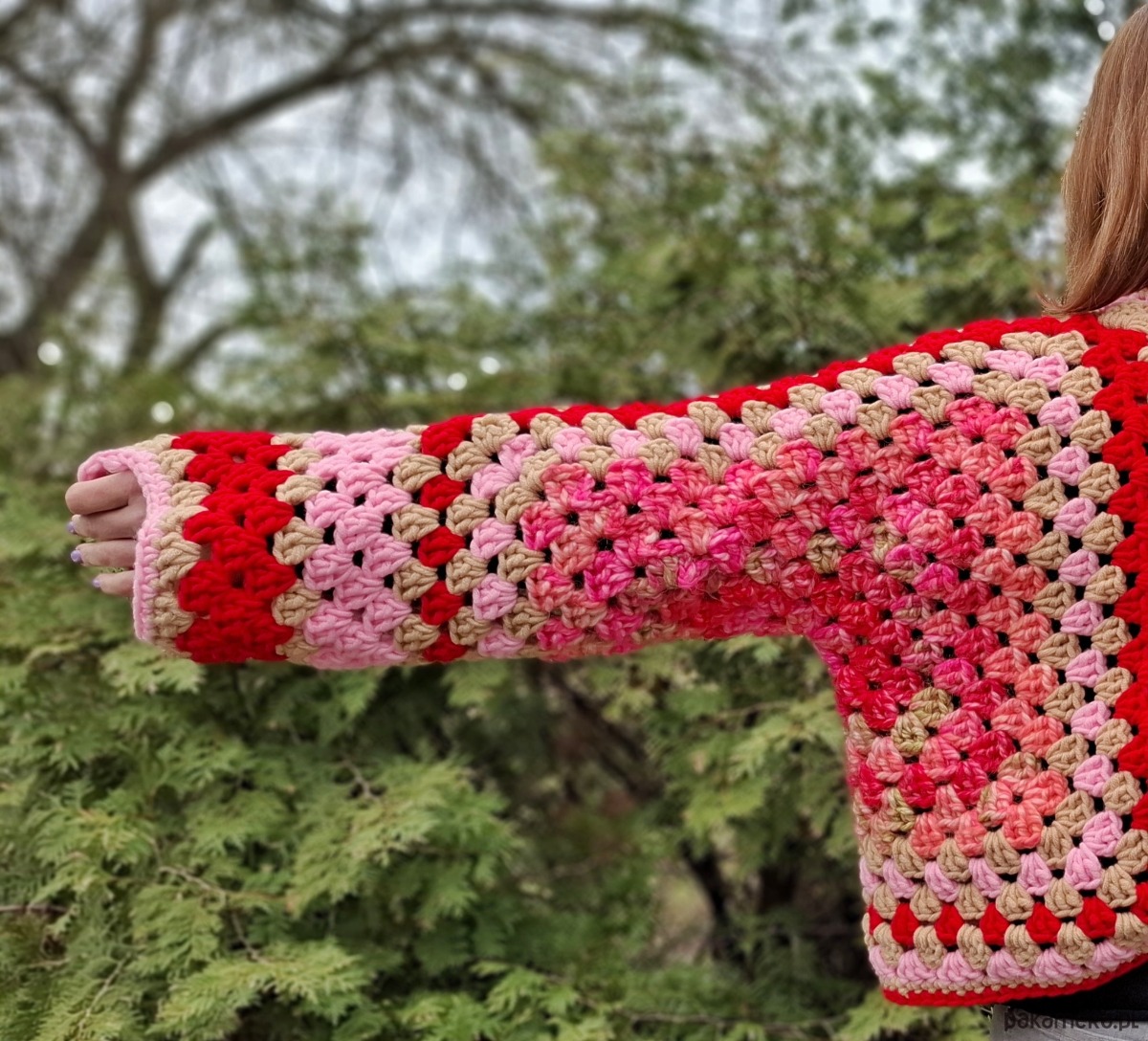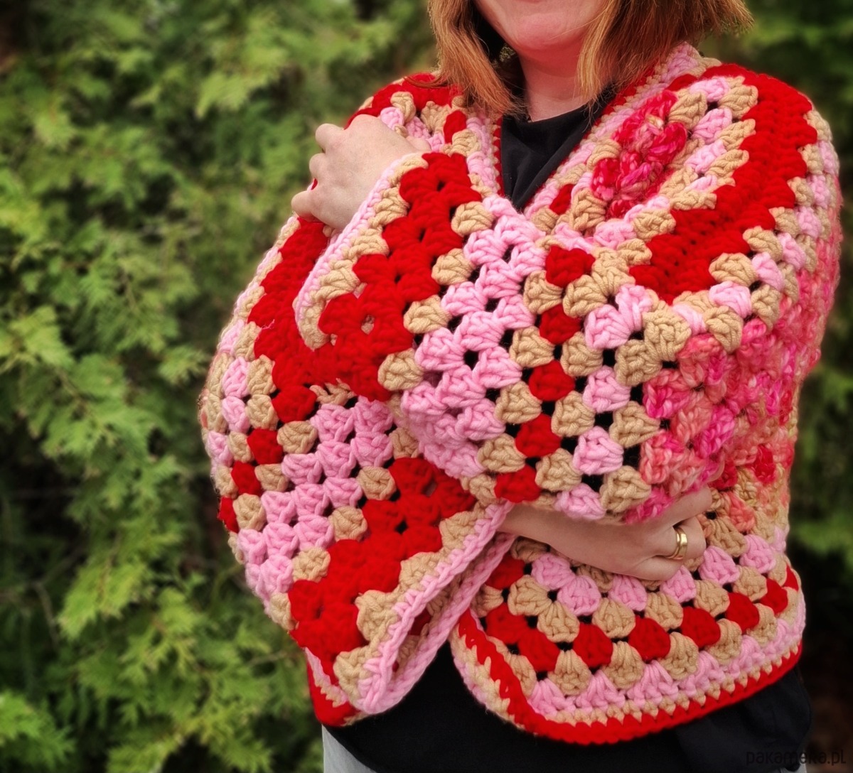 Kardigan został wykonany z grubych, miękkich włóczek w klasycznym wzorze typu „granny square”, dzięki czemu ma przyjemną strukturę i pięknie się układa. Luźny fason zapewnia wygodę i swobodę ruchów, a jednocześnie świetnie sprawdza się jako warstwa w chłodniejsze dni.