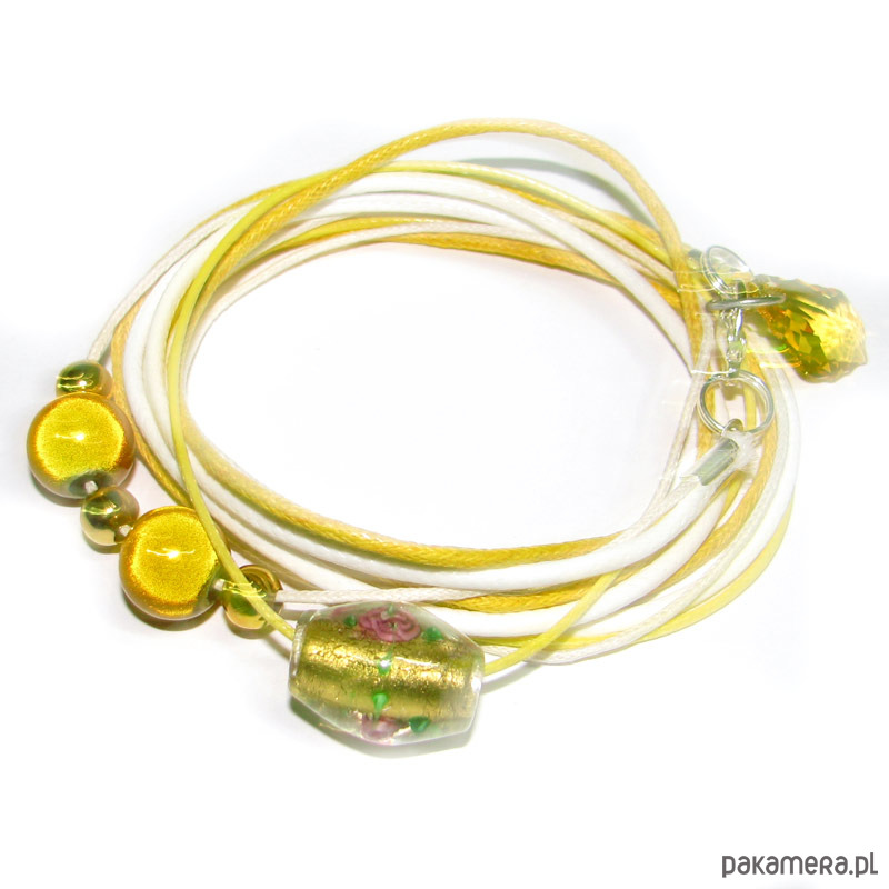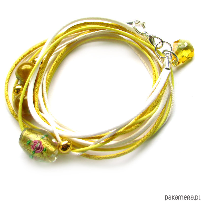 Bransoletka wykonana z żółtego i białego woskowanego sznurka bardzo dobrej jakości, korali lampwork, korali neonowych, pozłacanych przekładek oraz dowieszki Swarovski. Do 3-krotnego owinięcia wokół nadgarstka. Długość 55, pasuje na nadgarstek 15-18 cm. Zapięcie typu karabińczyk.