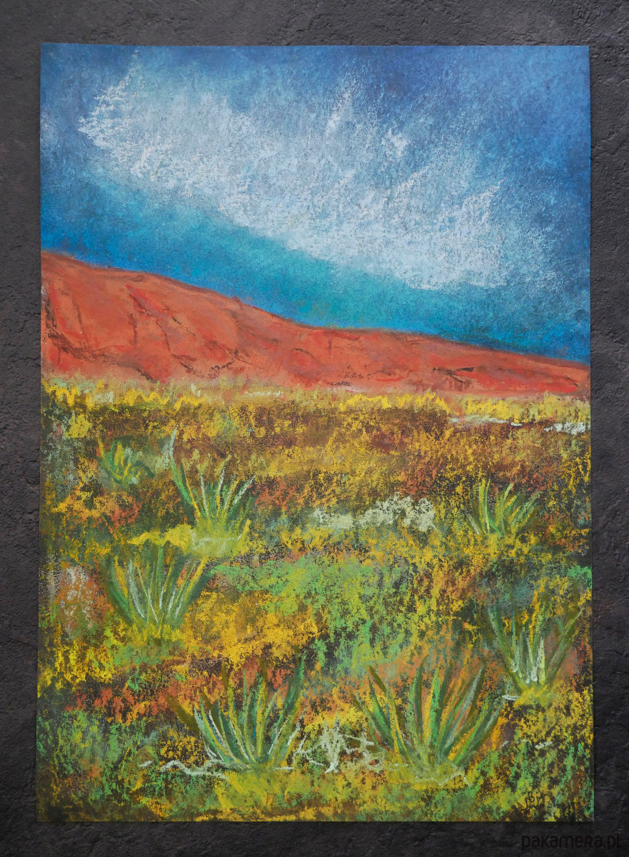 „W podróży” to ekspresyjny pejzaż pastelowy budujący napięcie kontrastem nasyconego błękitu i rdzawej ziemi. Dynamiczne, teksturowane pole pełne żółcieni nadaje pracy surowy, nowoczesny charakter. To kompozycja pełna energii dla osób ceniących wyrazistą sztukę.