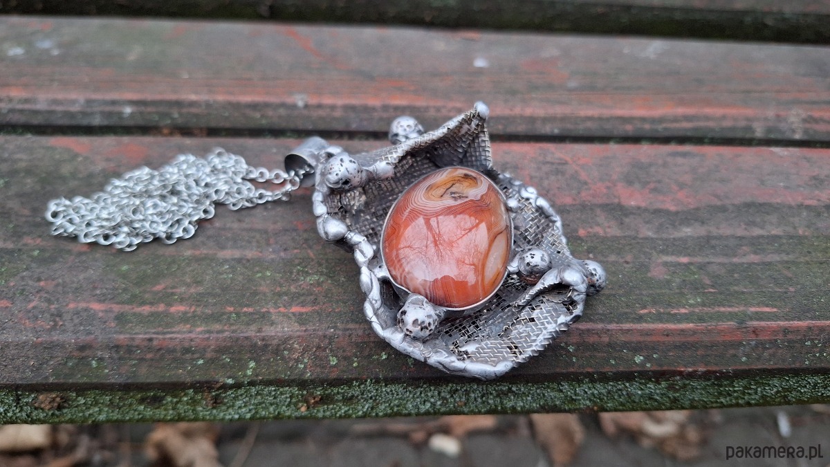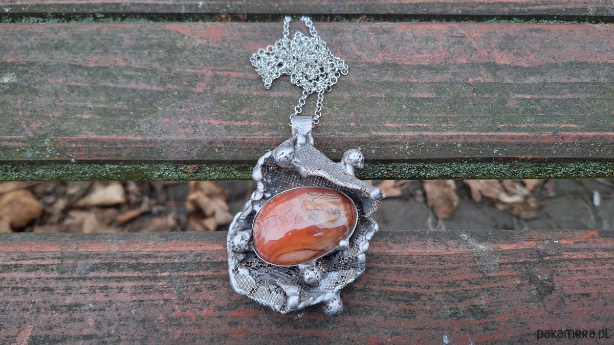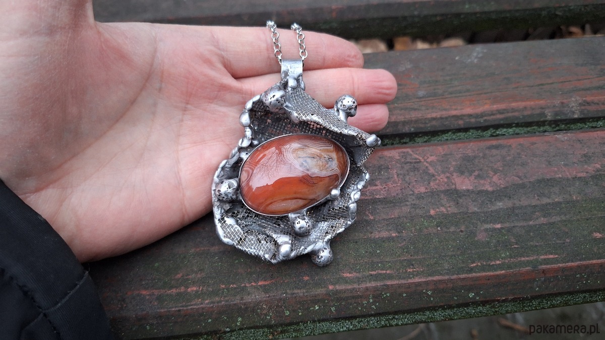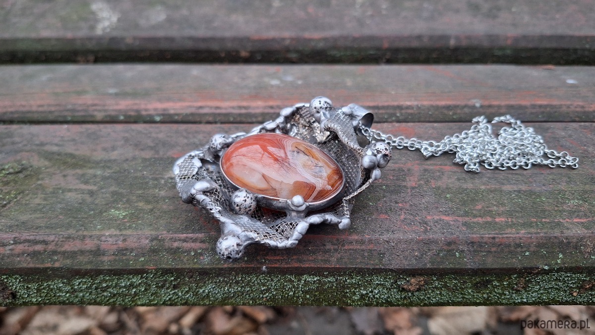 Duży wisior, wykonany z miedzi, cyny i agatu. Wymiary ok. 8.5 na 6 cm. Zawieszony na łańcuszku o długości ok. 80 cm.