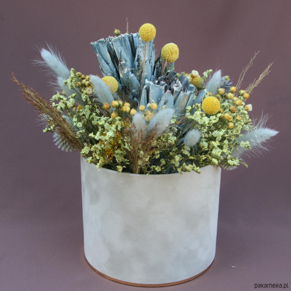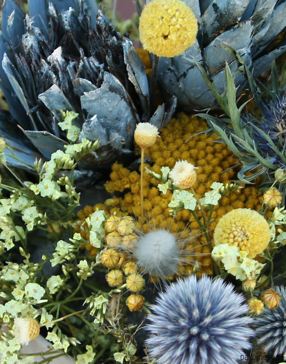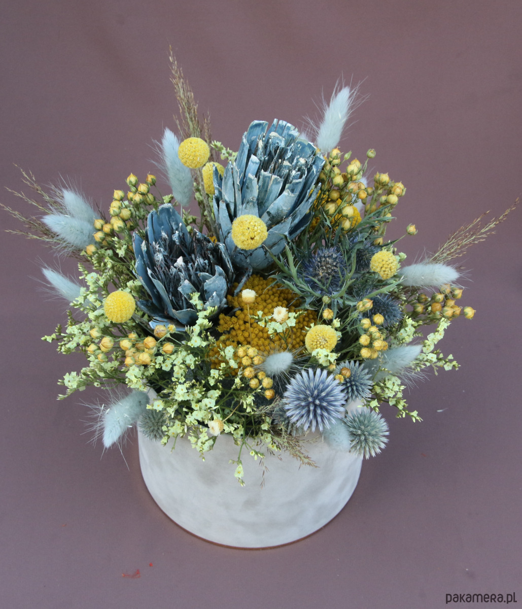 Jest to uniwersalna dekoracja pasująca do wnętrz we wszystkich stylach. Miły chłód błękitnego przegorzanu, protei i szarego dmuszka kontrastuje z żółtą kraspedią, krwawnikiem, lnem i zatrwianem.