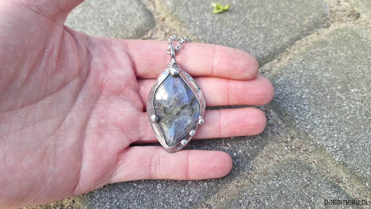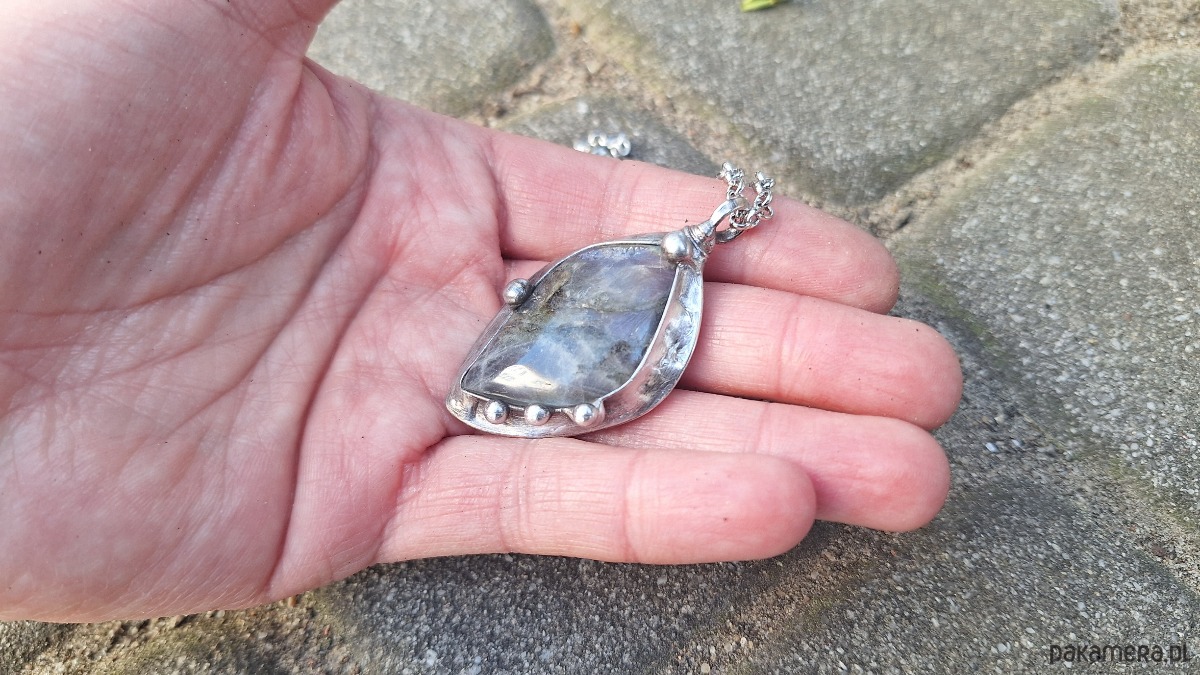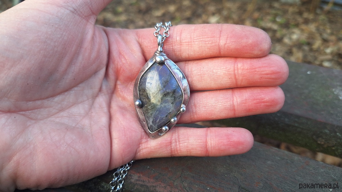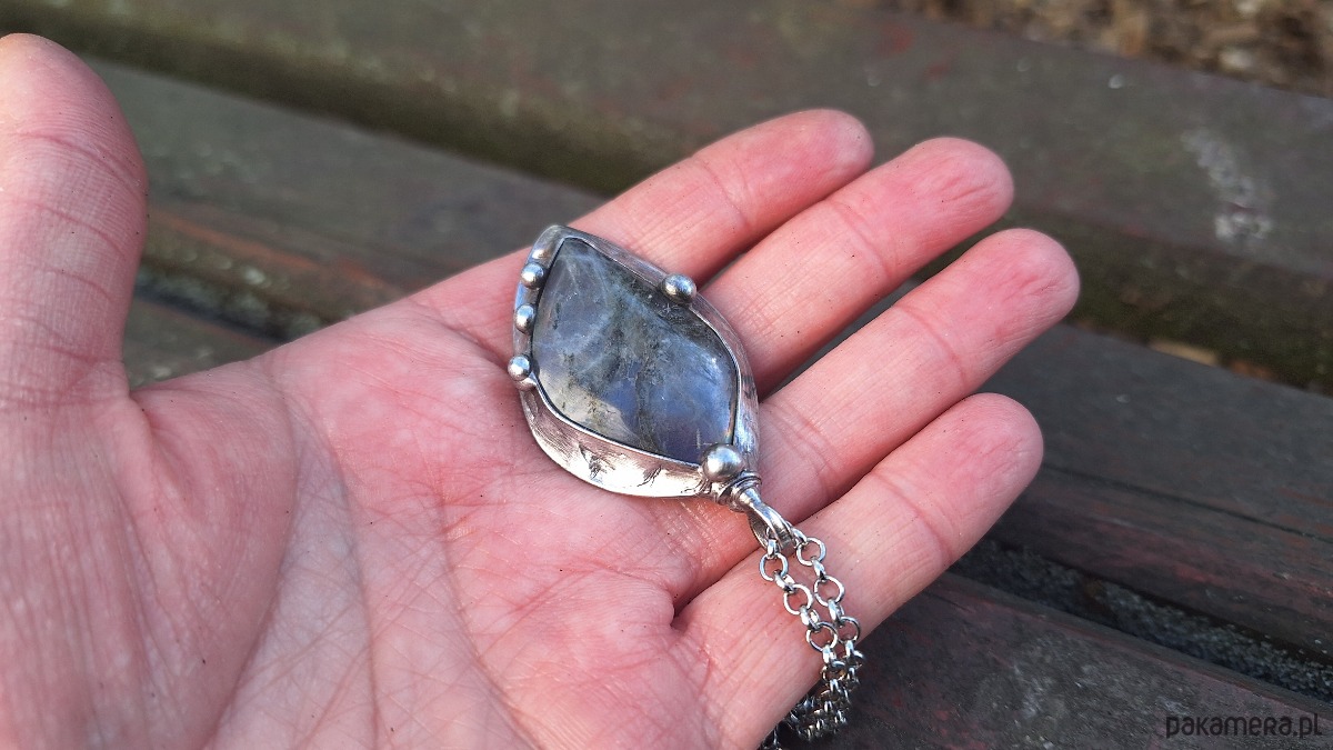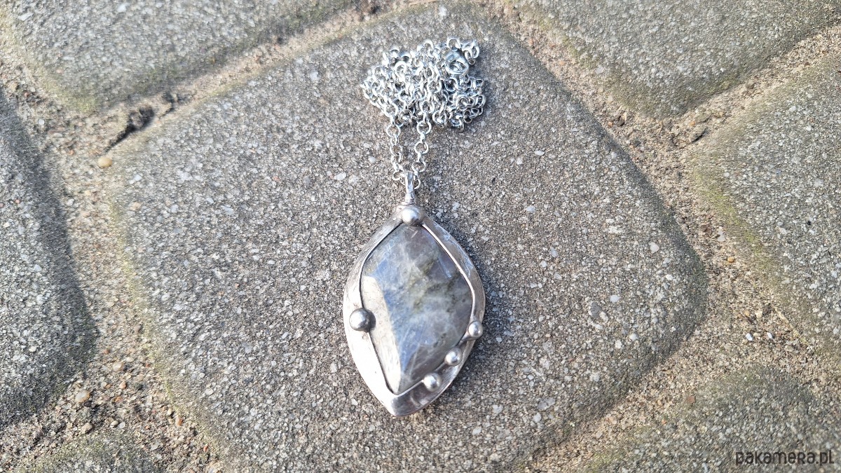 Wisiorek wykonany z miedzi, cyny i labradorytu. Wymiary ok. 4.5 na 3 cm. Zawieszony na łańcuszku o długości ok. 50 cm. Kamień jest szaro- fioletowy.