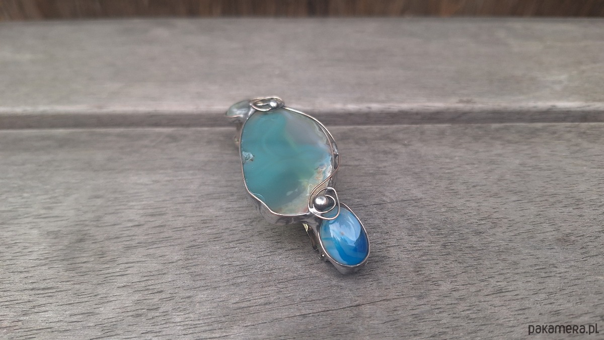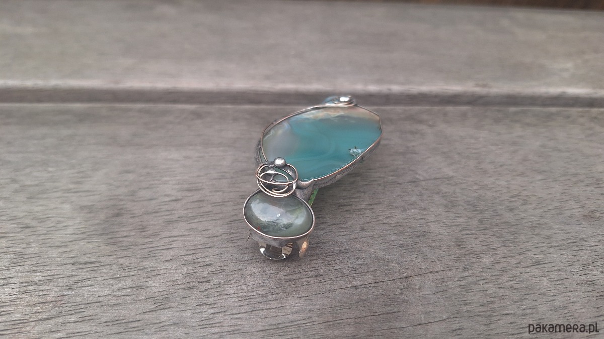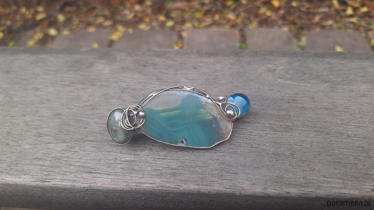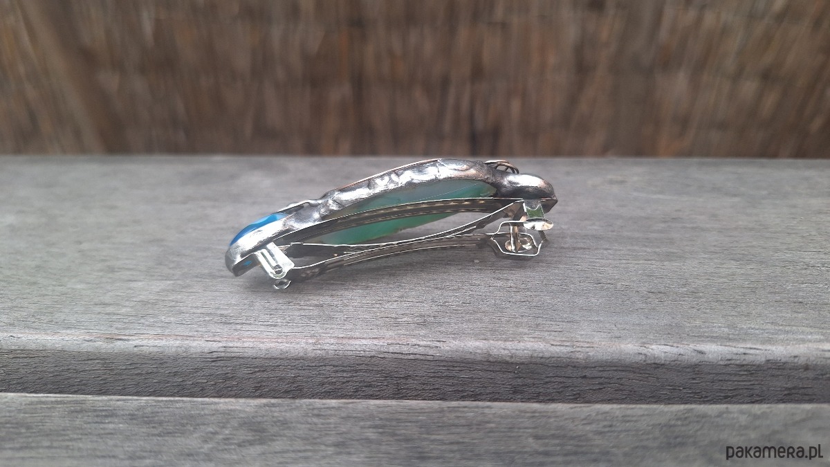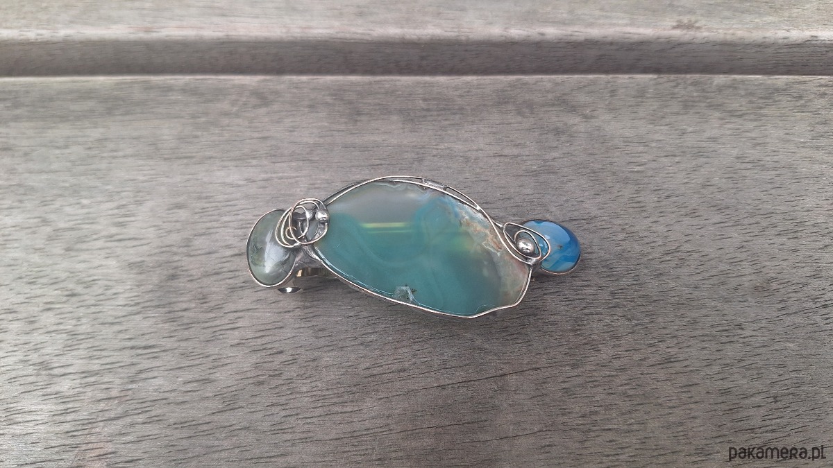 Klamra do włosów, wykonana z miedzi, cyny, jaspisu i agatów. Wymiary ok. 8 na 3 cm. Zapięcie 6 cm, metalowe.