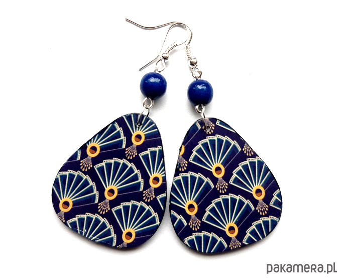 kolczyki drewniane, ozdobione metodą decoupage, dwustronne, starannie wykończone farbami akrylowymi i zabezpieczone wielokrotnie lakierem, koraliki drewniane, bigle posrebrzane, długość kolczyków bez bigli: 5,5 cm, szerokość: 3,5 cm, bardzo lekkie