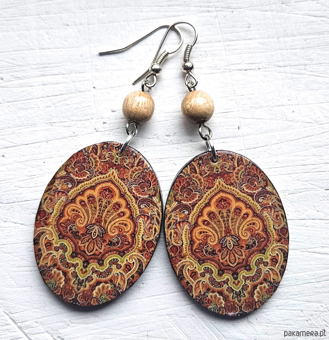 kolczyki drewniane, ozdobione metodą decoupage, dwustronne, starannie wykończone farbami akrylowymi i zabezpieczone wielokrotnie lakierem, koraliki drewniane, bigle posrebrzane, długość kolczyków bez bigli: 6 cm, szerokość: 3 cm, bardzo lekkie