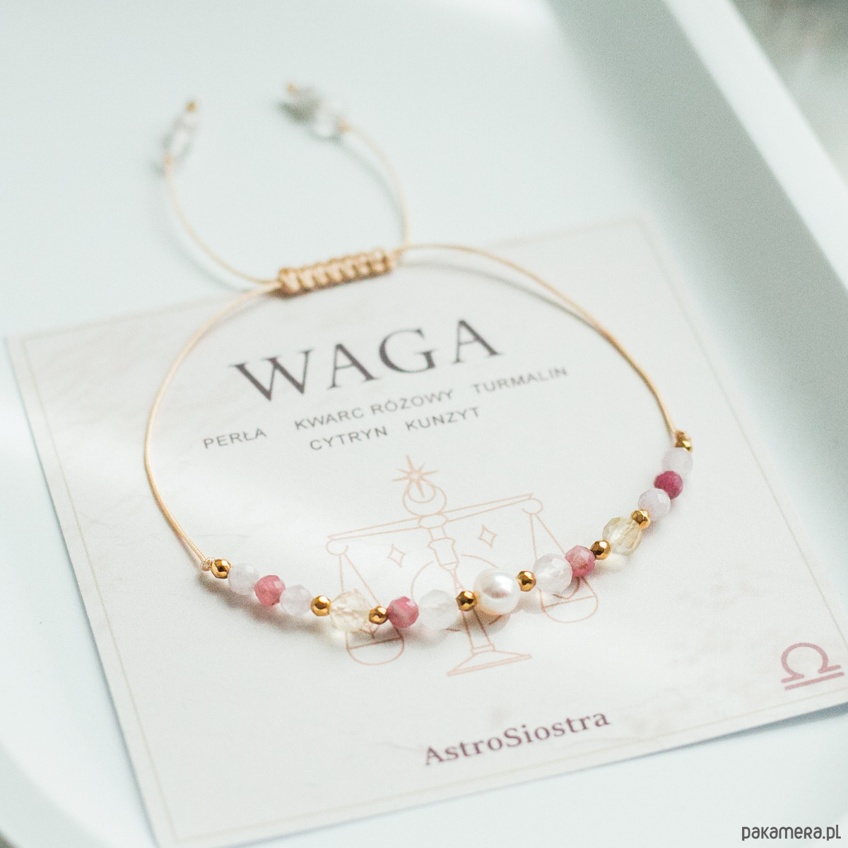 Zodiak WAGA- bransoletka z kamieniami dla zodiakalnej Wagi: Perła, Kwarc Różowy, Turmalin Różowy, Cytryn i Kunzyt.