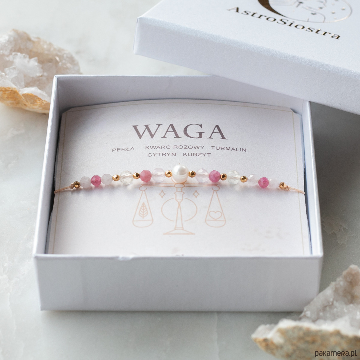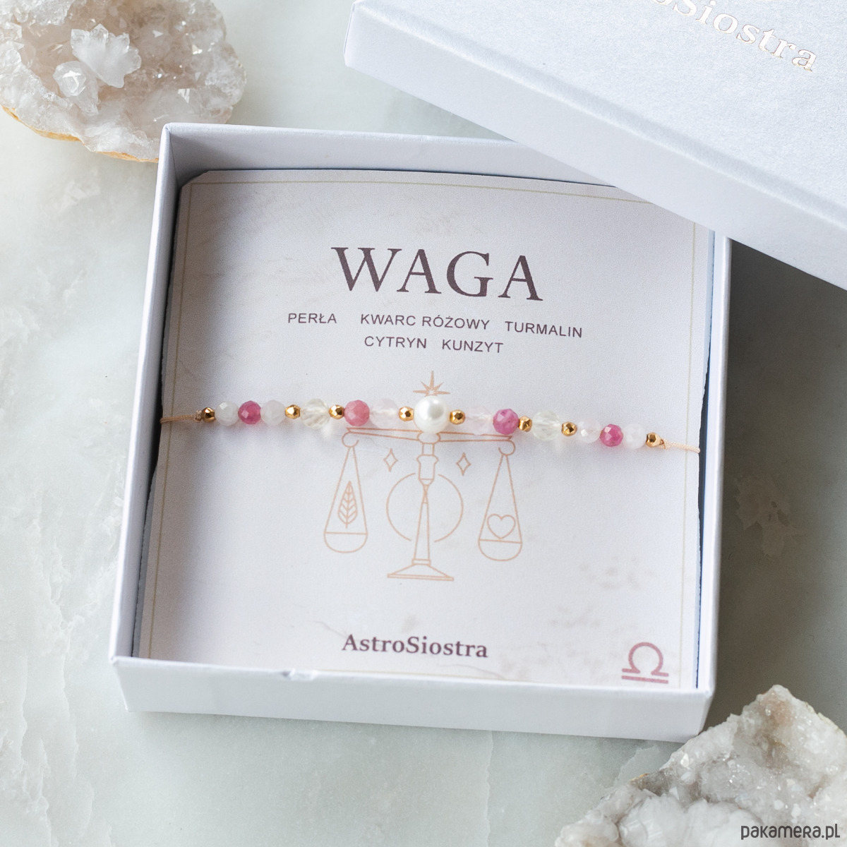 Bransoletka jest zapakowana w ozdobne pudełko z wraz z karteczką ZODIAK WAGA i opisem właściwości kamieni.