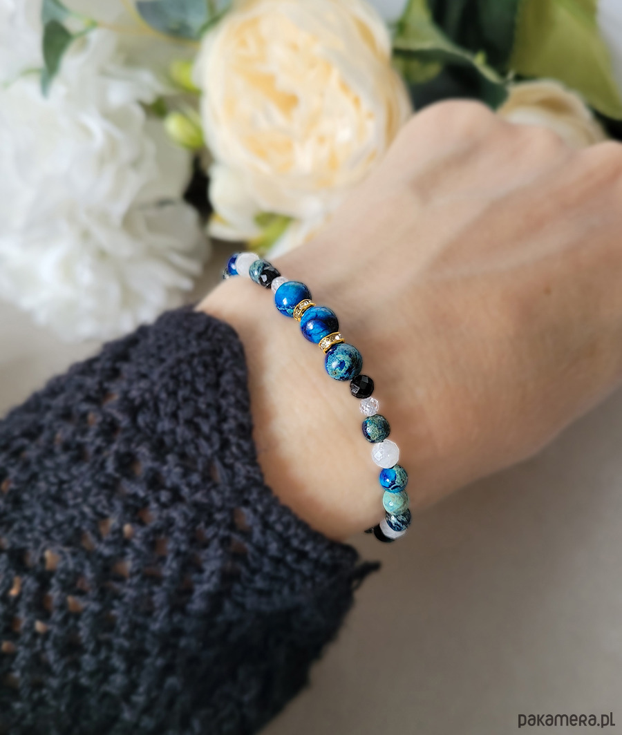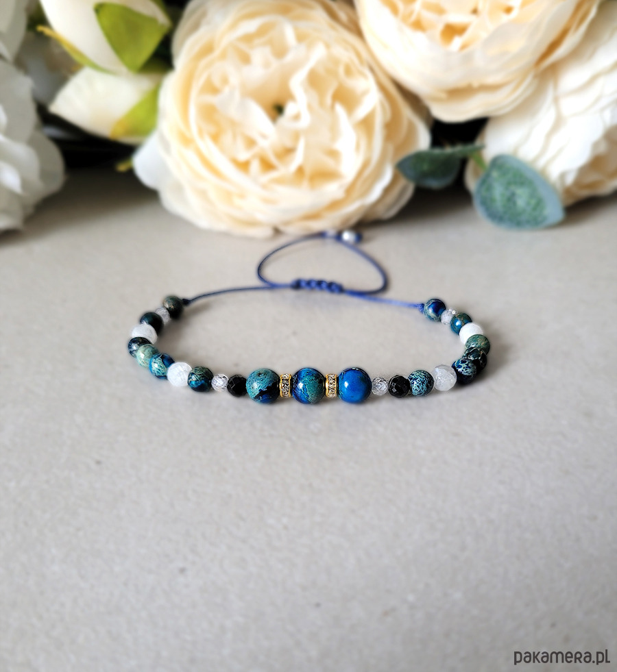 Bransoletka zrobiona z kamieni naturalnych: Turmalinu, Jaspisu Cesarskiego, Kamienia księżycowego i Cyrkonii głównie przeznaczona dla zodiakalnej Wagi.