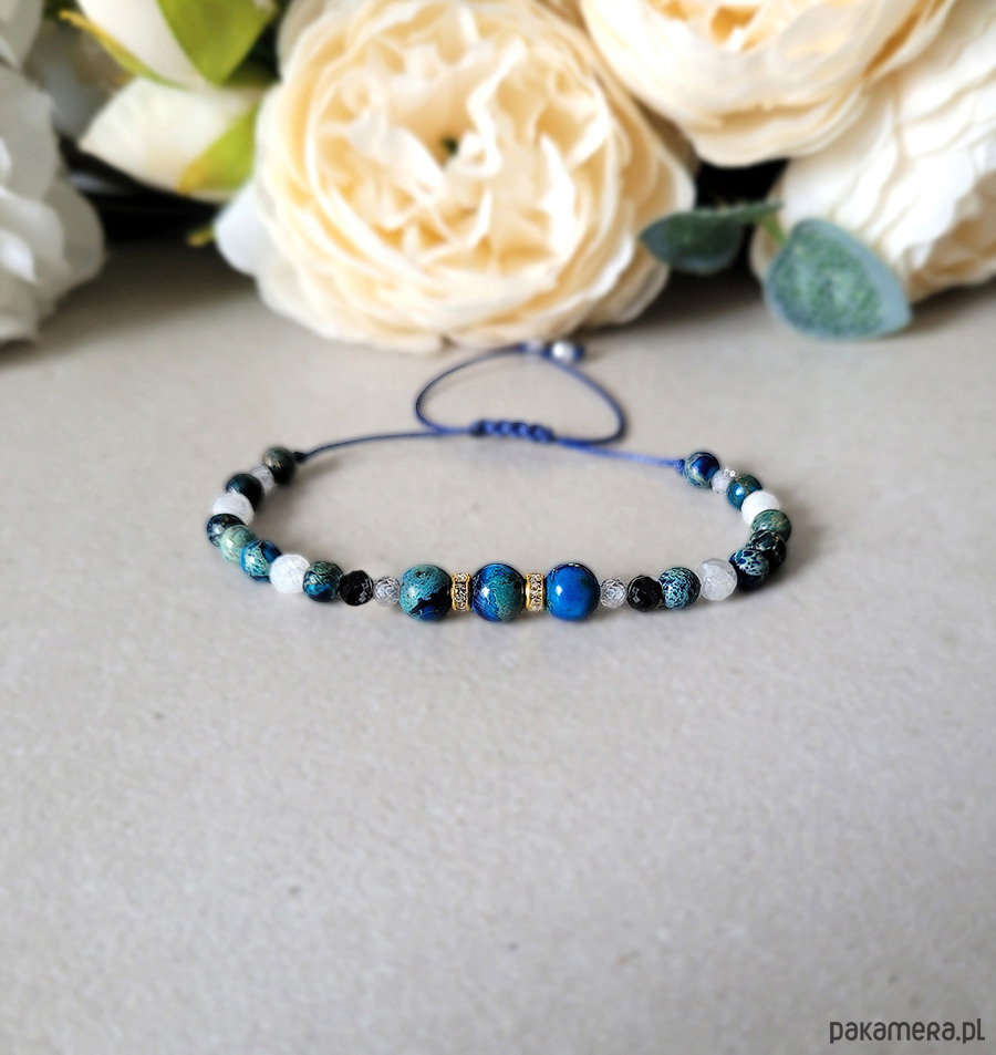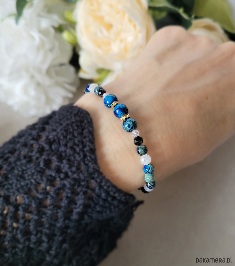 Bransoletka zrobiona z kamieni naturalnych: Turmalinu, Jaspisu Cesarskiego, Kamienia księżycowego i Cyrkonii głównie przeznaczona dla zodiakalnej Wagi.