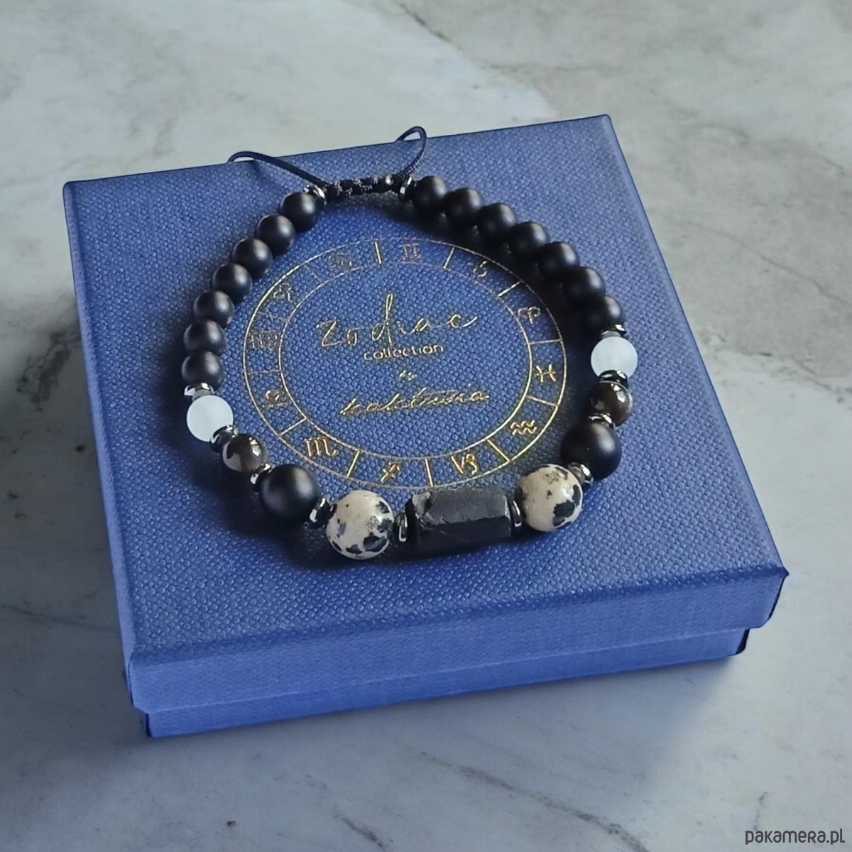 TUTAJ: Bransoletka na solidnym sznurku nylonowym, wykonana z: surowej bryłki czarnego turmalinu, kamieni 10mm: onyks mat, jaspis dalmatyński; kamieni 6mm: matowego onyksu, akwamarynu, obsydianu, przekładek z hematytu.