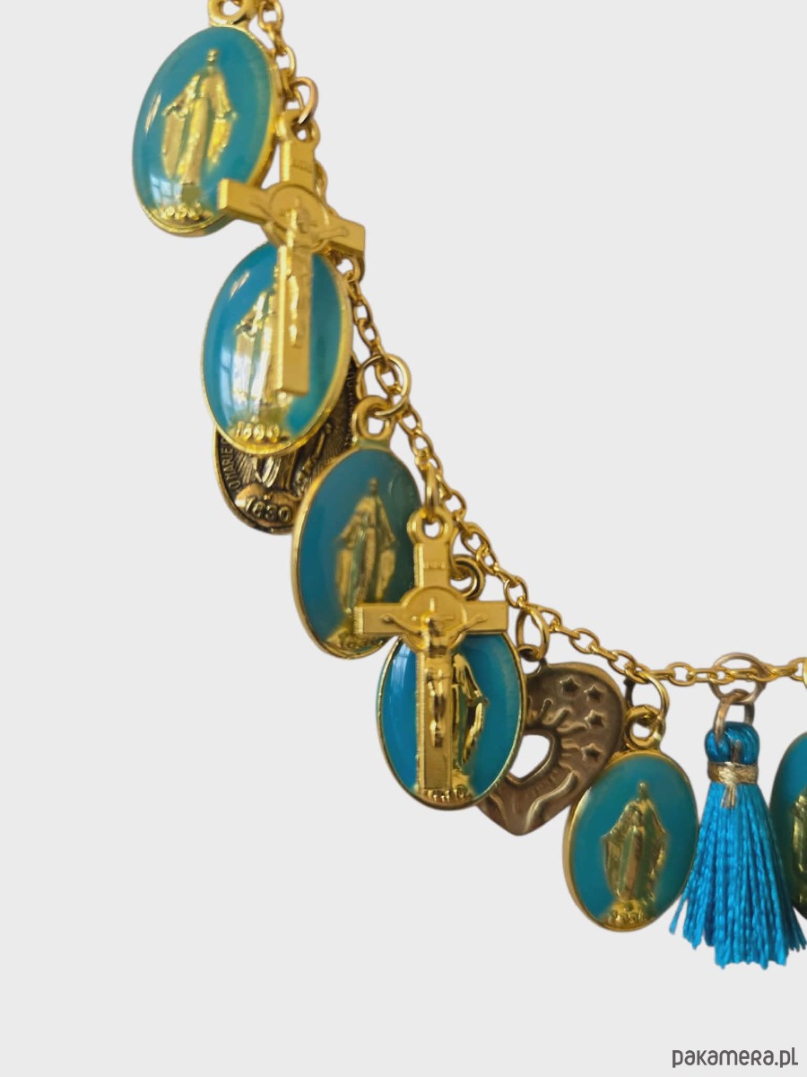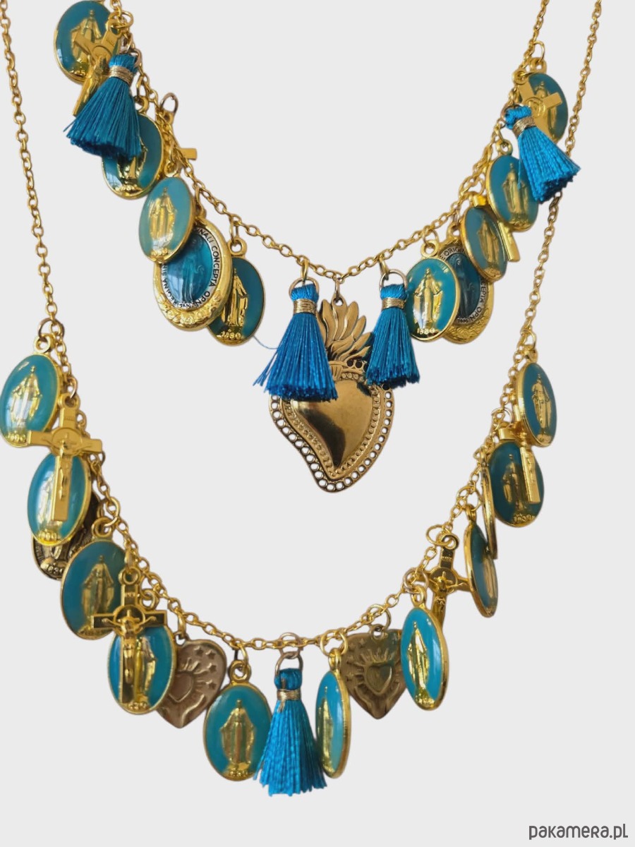 Bogato zdobiony naszyjnik, łańcuszki w kolorze złota zostały bogato ozdobione ręcznie malowanymi medalikami . Całość uzupełniają jedwabne chwosty z odcieniu niebieskim. Naszyjnik pięknie łączy elementy turkusowe ze złotym kolorami dodatków i łańcuszków . Idealny dodatek do prostych stylizacji.