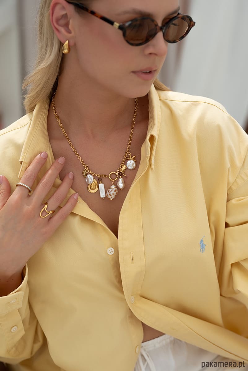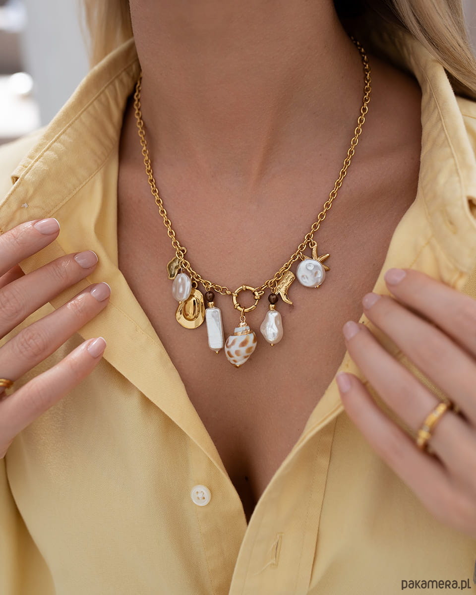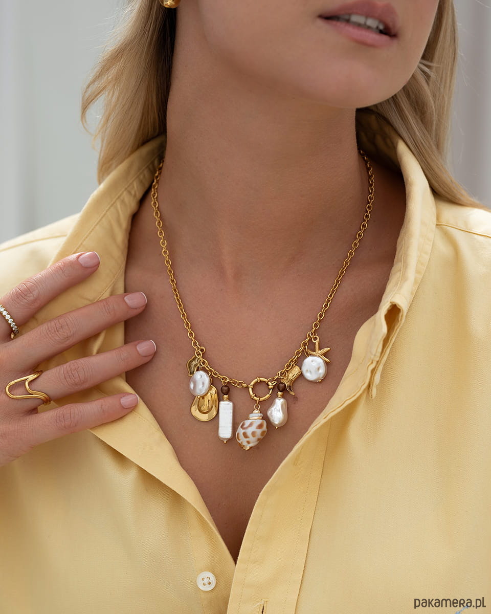 Zainspirowany magią oceanu i letnim luzem – naszyjnik Seashell to esencja wakacyjnej biżuterii. Połączenie złocistych akcentów z naturalnymi muszlami przywodzi na myśl plażę o zachodzie słońca i ciepły piasek pod stopami. To modny naszyjnik na lato, który podkreśli Twoją opaleniznę i doda stylizacji lekkości.Zachwyca nie tylko wyglądem – stal chirurgiczna, z której został wykonany, zapewnia trwałość i odporność na wodę. Nie musisz się martwić, że straci swój kolor – to biżuteria, która nie ciemnieje i nie ściera się nawet podczas intensywnych wakacji.Idealny dla kobiet kochających boho vibe, ale też świetnie sprawdzi się w minimalistycznych stylizacjach jako centralny, przyciągający uwagę akcent. Noś go solo albo zestaw z innymi delikatnymi łańcuszkami – efekt WOW gwarantowany.To także cudowny naszyjnik na prezent – na urodziny, wakacyjny wyjazd albo po prostu – dla siebie.Wymiary: długość 45 cm + 5 cm przedłużenia, zawieszki ok. 2,3 cmWaga: 22,4 gMateriał: stal chirurgiczna 316L, muszle naturalne, wodoodporny, hipoalergiczny