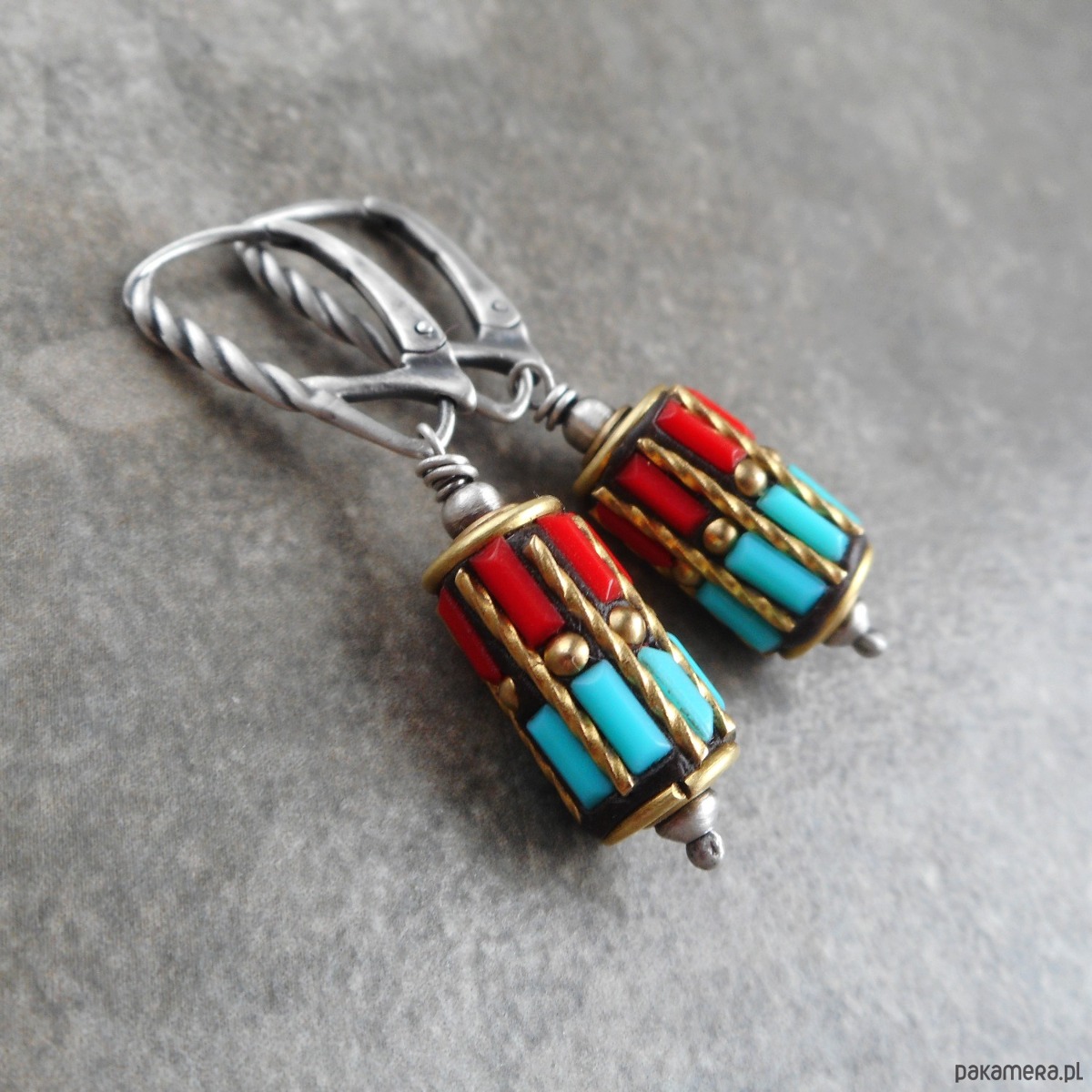 Kolczyki wykonane z kamieni naturalnych i szlachetnego srebra; oryginalne, w etnicznym stylu, z tybetańskimi mosiężnymi koralikami w kształcie walca, zdobionymi turkusem i koralem (18x8 mm)