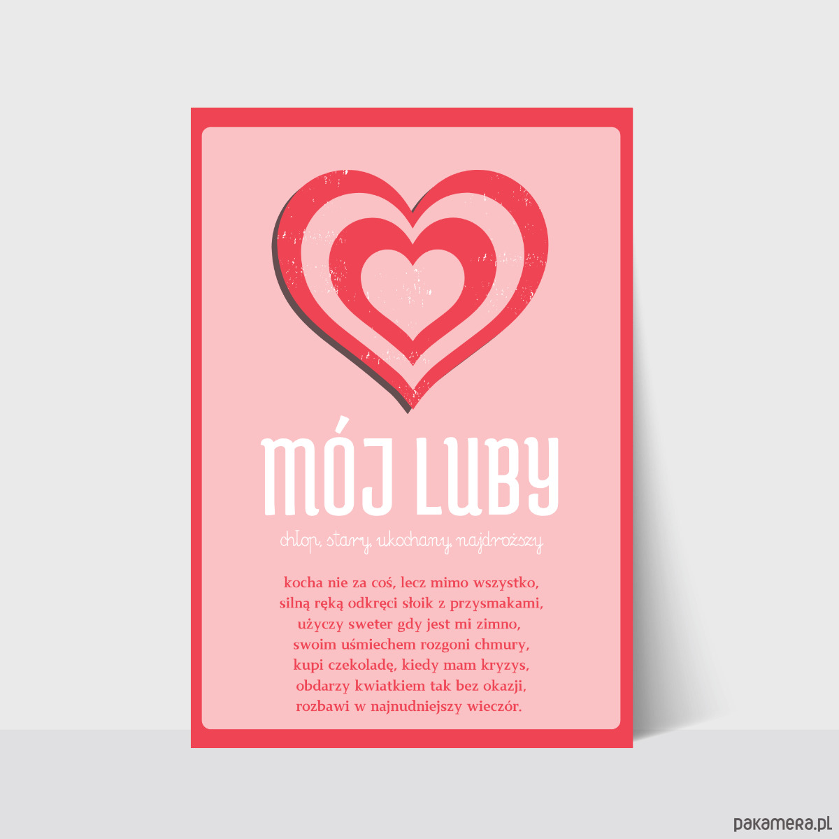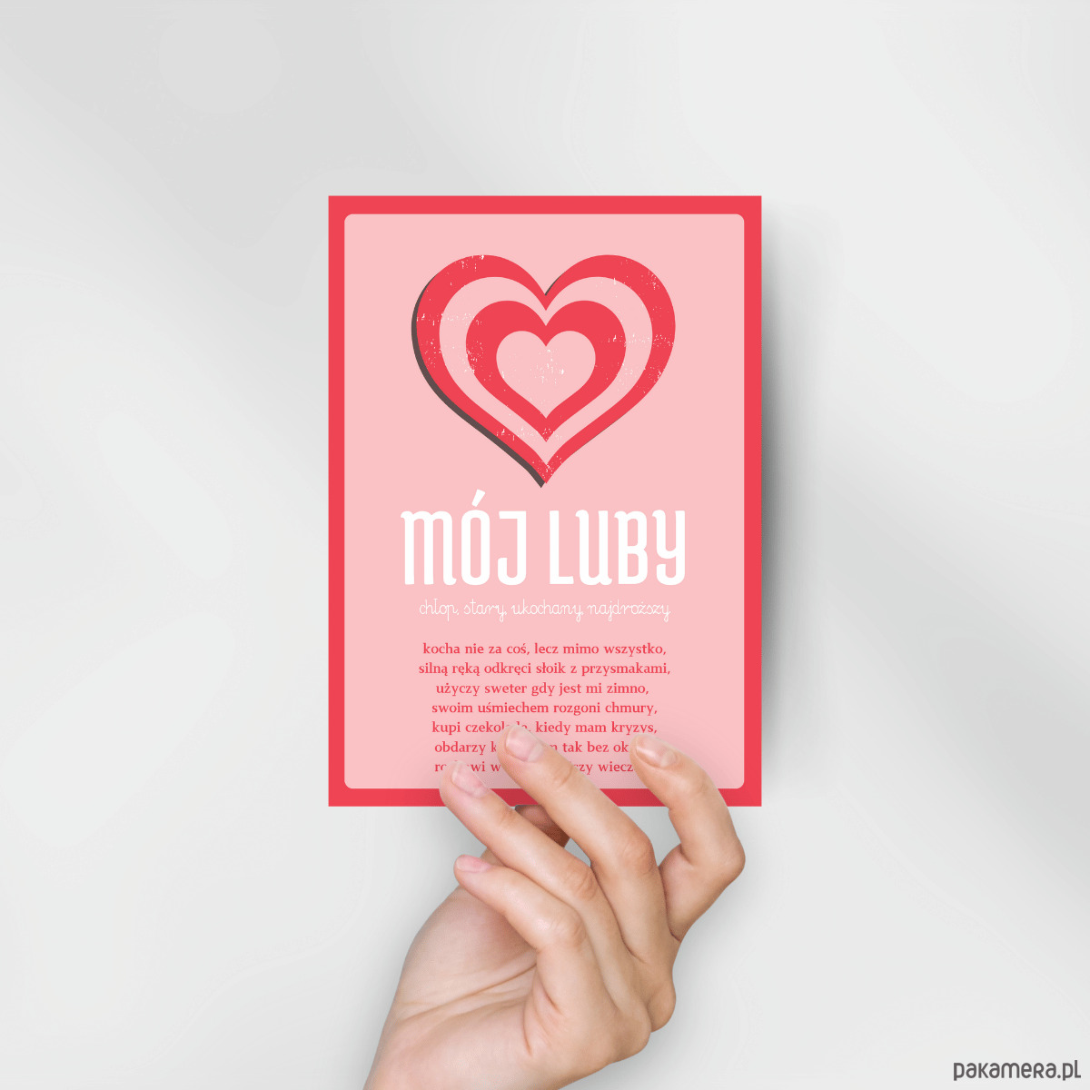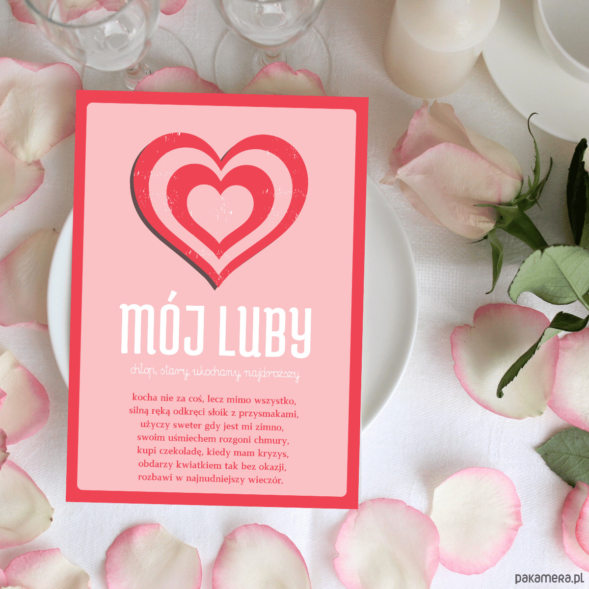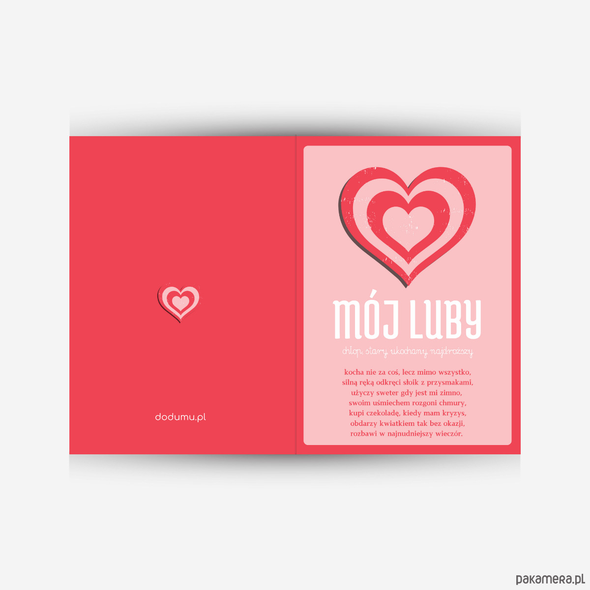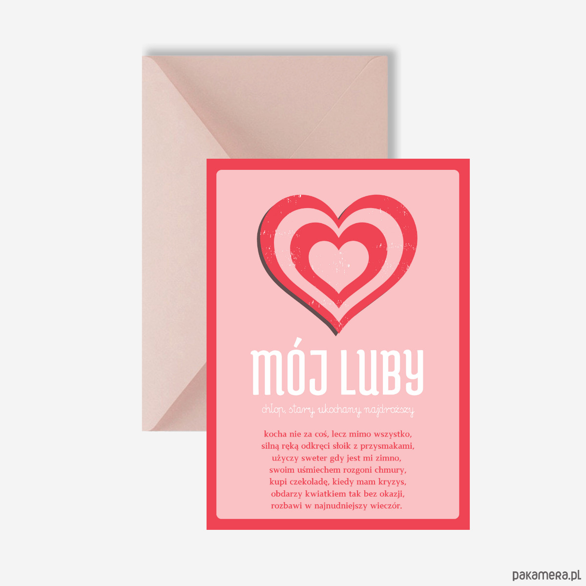Ten uroczy kartonik powstał dla okazania miłości z wyrażeniem Mój Luby, które jest oznaką czułości. Do tego na nim serduszko i wyznania zgrabnie ułożone, by uczucia zostały właściwie wyrażone. Nie trzeba czekać specjalnej okazji, by okazać co w sercu, choć ta kartka sprawdzi się na Walentynki, rocznice, Dzień Mężczyzny, Dzień Chłopaka, urodziny ukochanego, zaręczyny, czy dzień, kiedy staniecie na ślubnym kobiercu. Z taką kartką okolicznościową w kolorach miłości zaskoczysz swego ukochanego, chłopaka, męża, narzeczonego, drugą połówkę i sprawisz mu ogrom radości. Taki karnet jest miłym gestem, wzrusza szczerymi życzeniami i pozwala się dzielić uczuciami. W walentynkowej formie, z pięknym serduszkiem, zwieńczony opisem jego wspaniałości, taki karnet będzie najlepszym podarkiem niezależnie od uroczystości. Do tego koperta kolorystycznie dobrana, dzięki której kartka może być jako mały upominek wręczana.