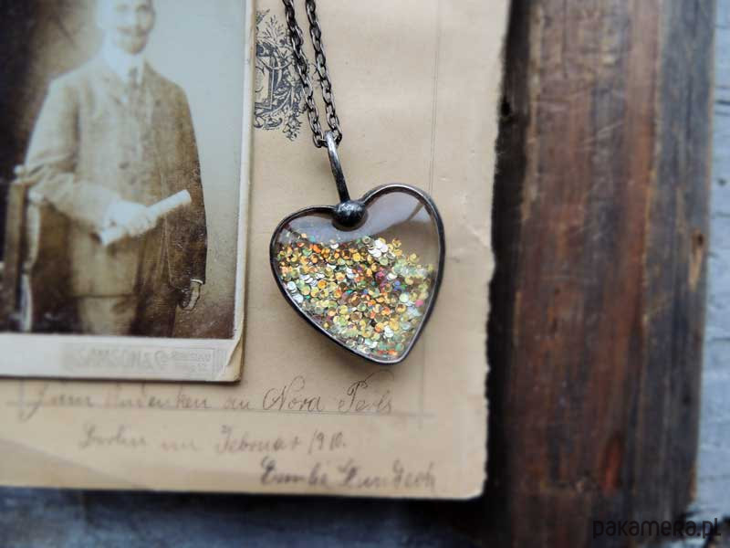 Wyjątkowy naszyjnik w kształcie serca, wykonany ze szła, wypełniony swobodnie poruszającym się brokatem w kolorze srebra ?