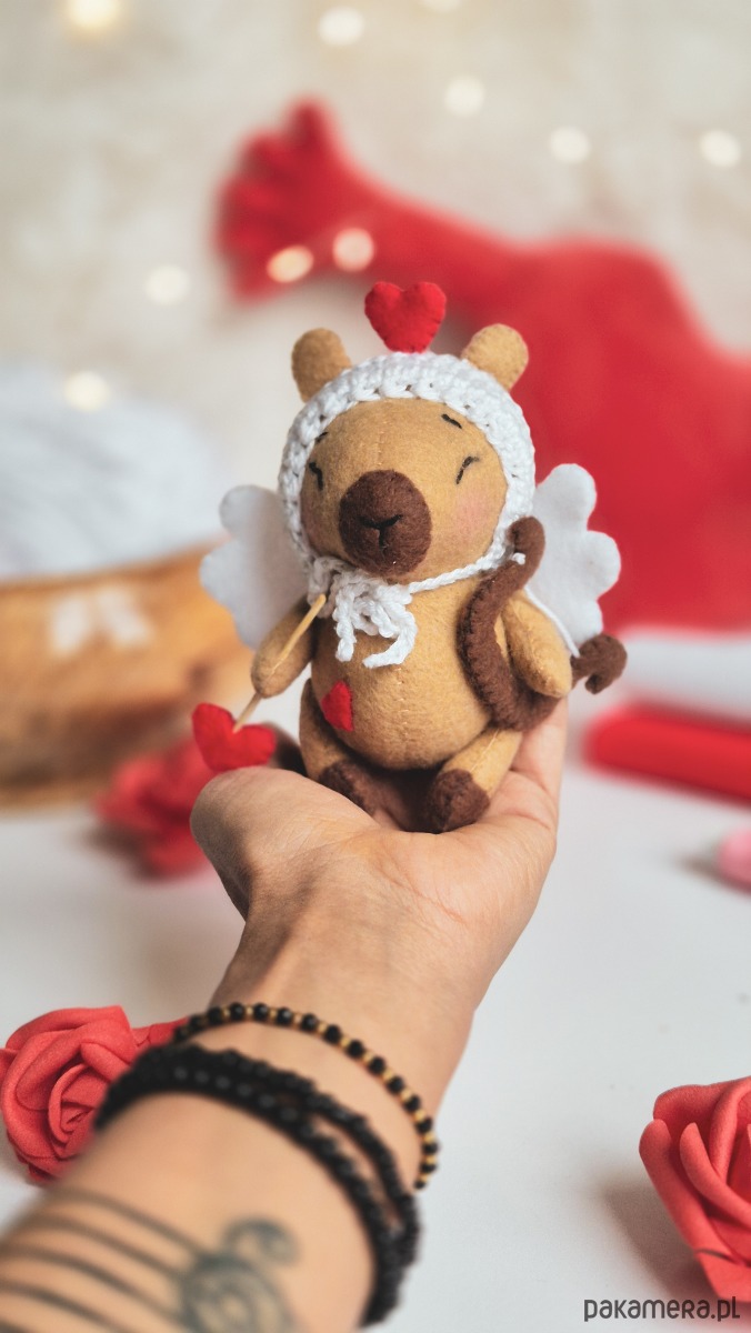 Każda capybara jest szyta ręcznie z dbałością o detale, co sprawia, że każda sztuka jest wyjątkowa. Ciepła kolorystyka, delikatne materiały i przyjazny charakter czynią ją idealnym prezentem na walentynki, rocznicę lub bez okazji.