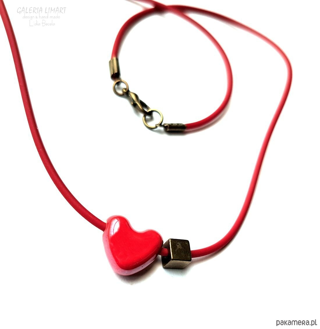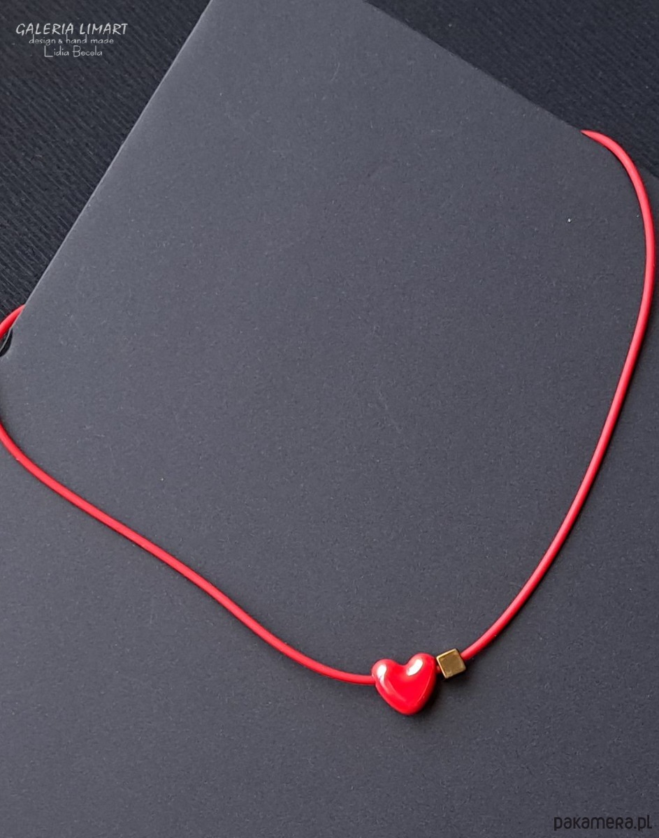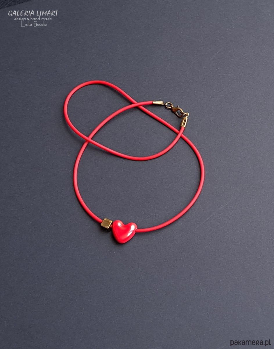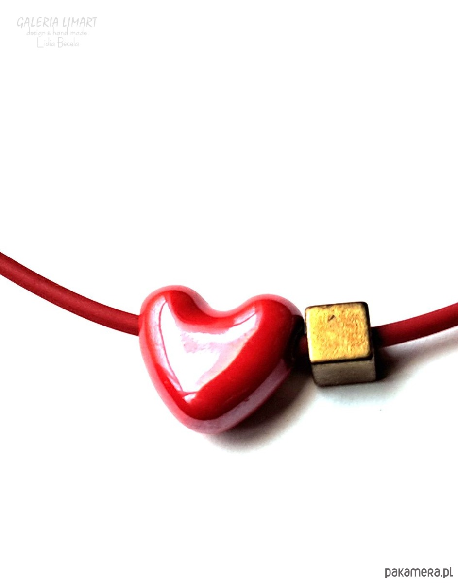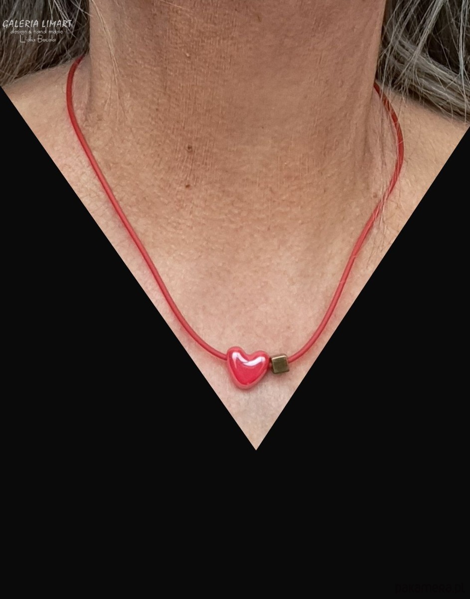 Delikatny, efektowny, niewielki (ok.1,5 cm) wisiorek w kształcie cudnego serduszka z pięknej ceramiki w bosko czerwonej tonacji, dodatkowo ozdobiony kubikiem z mosiądzu. Zawieszony na czerwonym, dopasowanym kolorystycznie kauczukowym rzemieniu ok 44 cm..