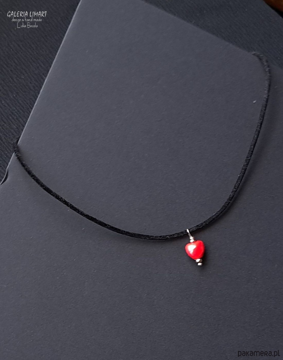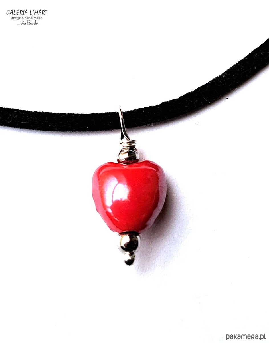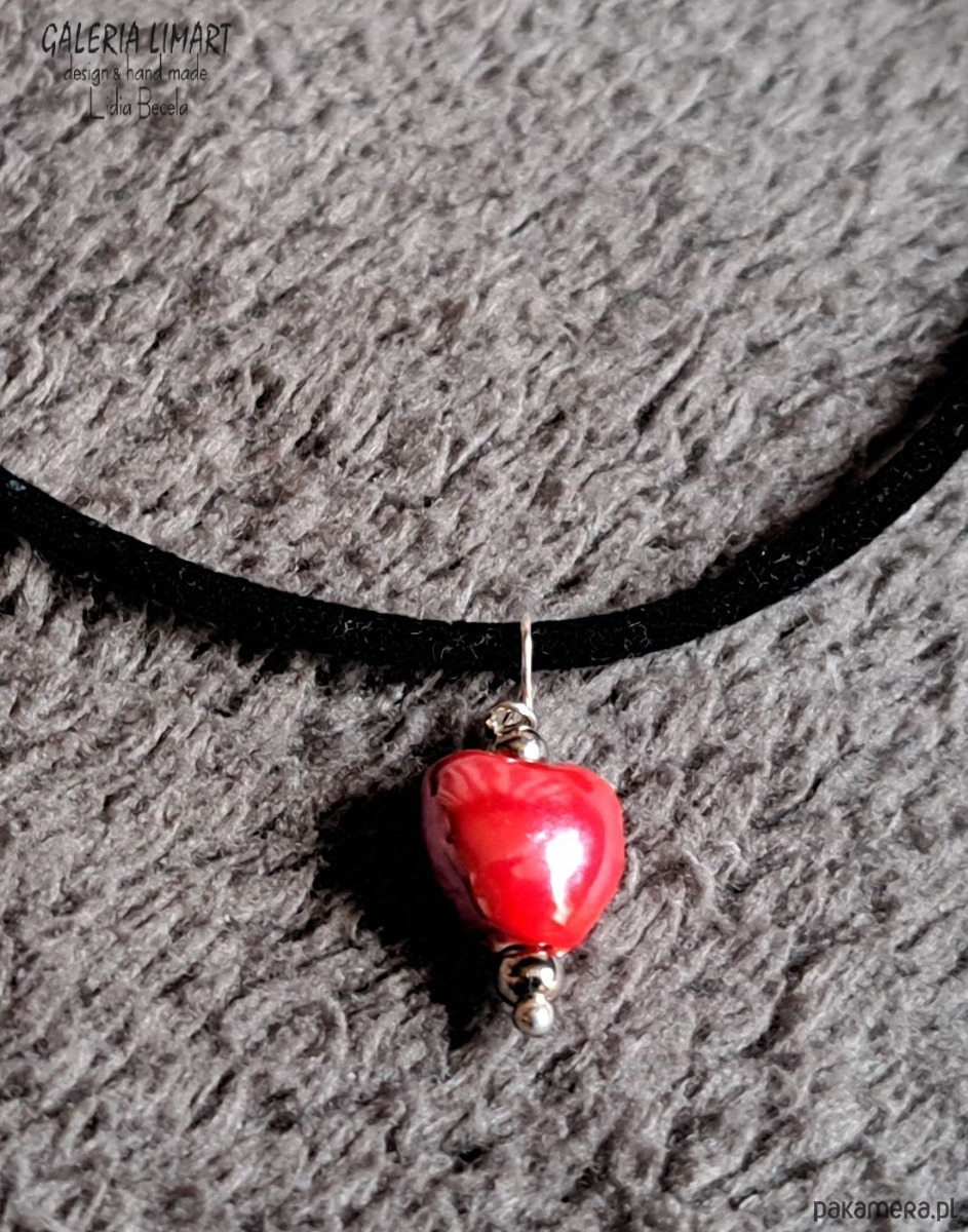 Delikatny, efektowny, malutki (ok.1 cm) wisiorek w kształcie cudnego serduszka z pięknej ceramiki w bosko czerwonej tonacji, zawieszony na czarnej okrągłej aksamitce zapinanej na karabińczyk ok. 44 cm + łańcuszek regulacyjny.