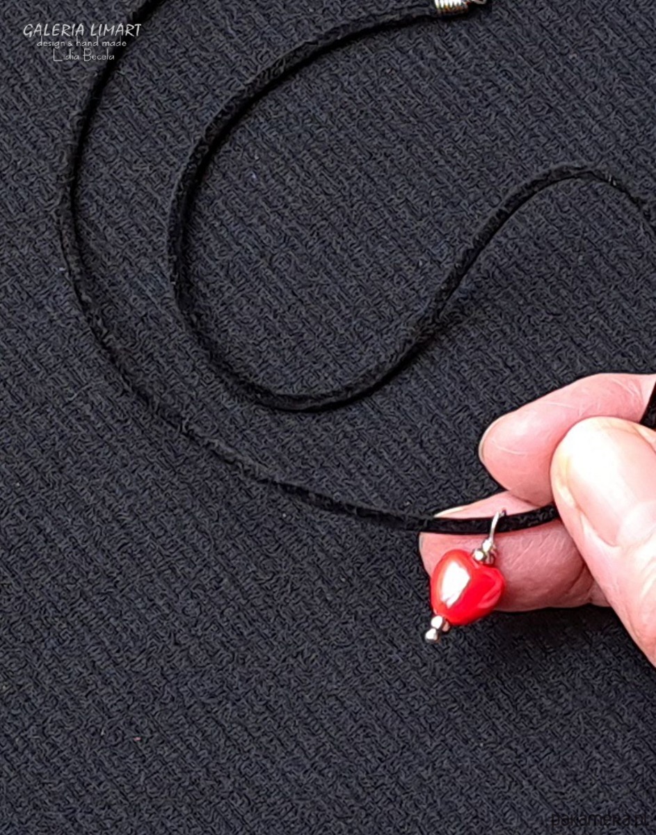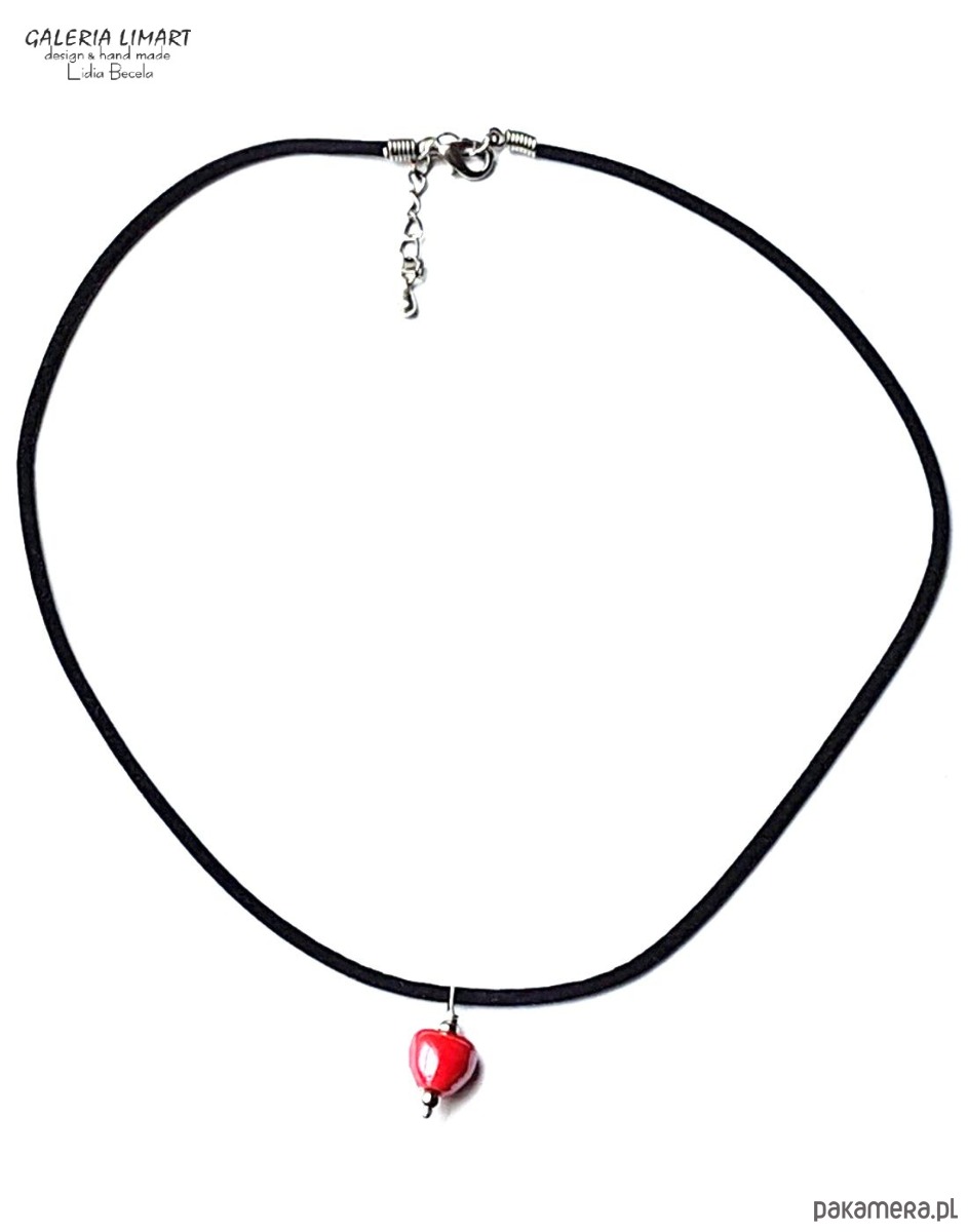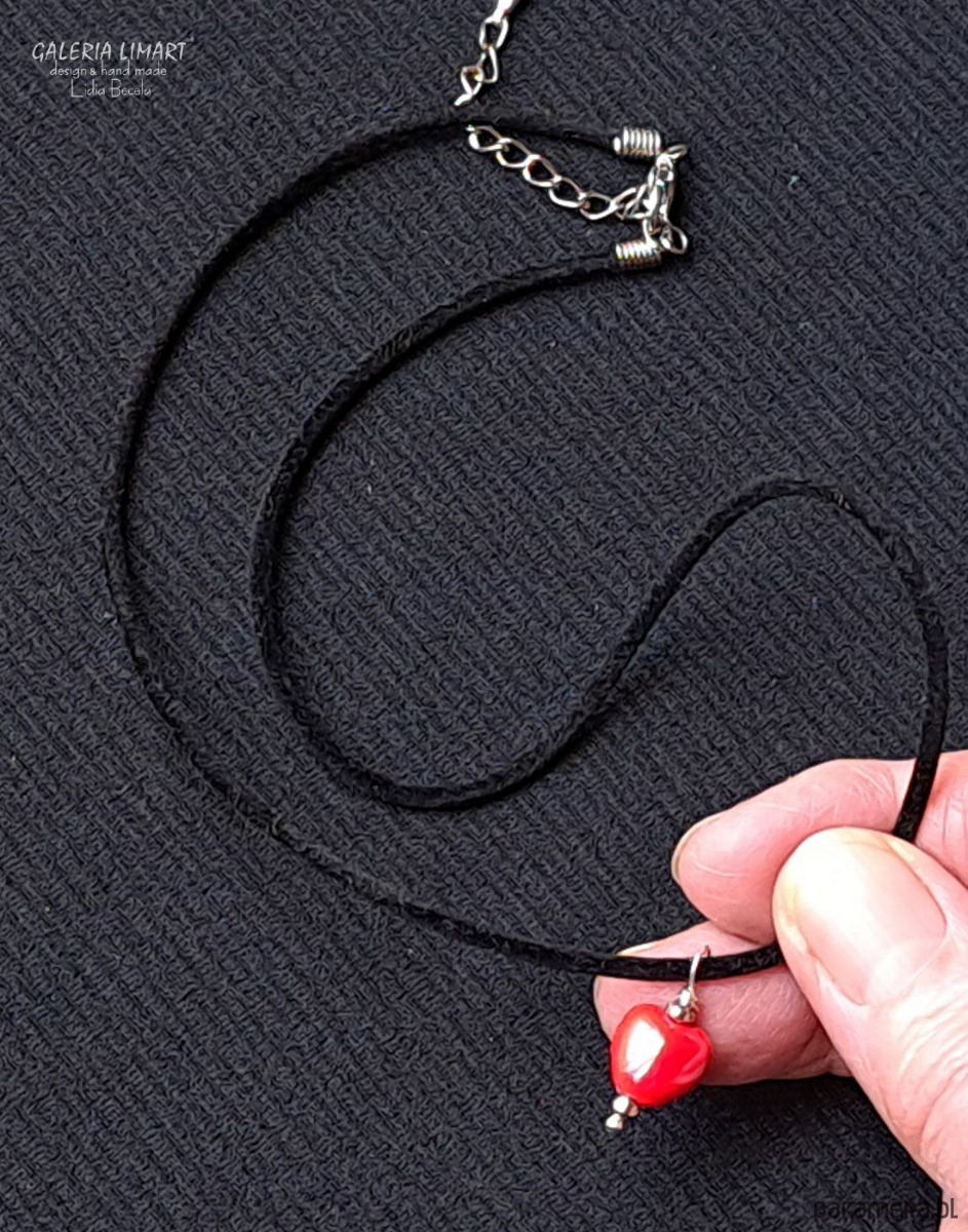 Delikatny, efektowny, malutki (ok.1 cm) wisiorek w kształcie cudnego serduszka z pięknej ceramiki w bosko czerwonej tonacji, zawieszony na czarnej okrągłej aksamitce zapinanej na karabińczyk ok. 44 cm + łańcuszek regulacyjny.