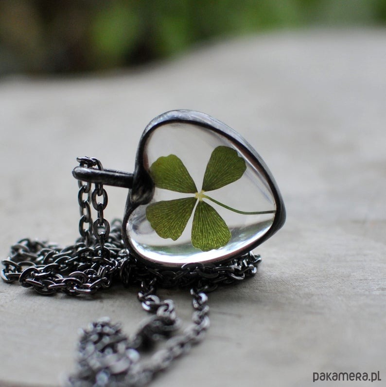 Za szkłem w kształcie serca, umieszczona została prawdziwa, ususzona czterolistna koniczynka.