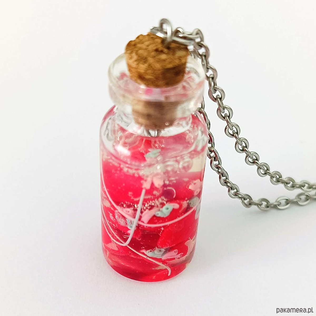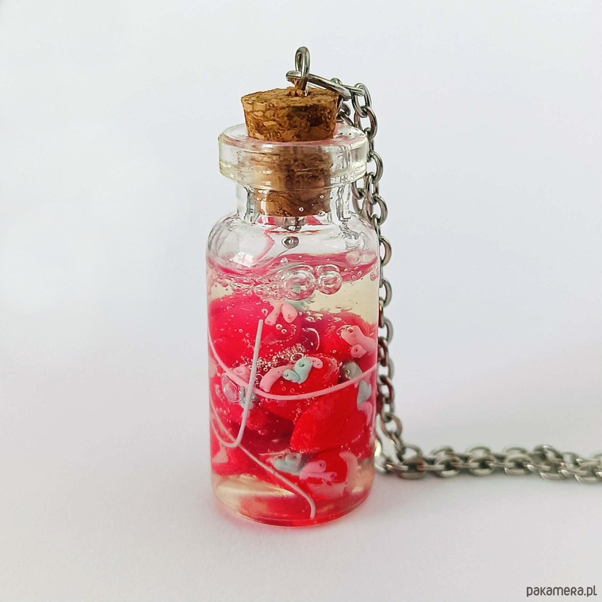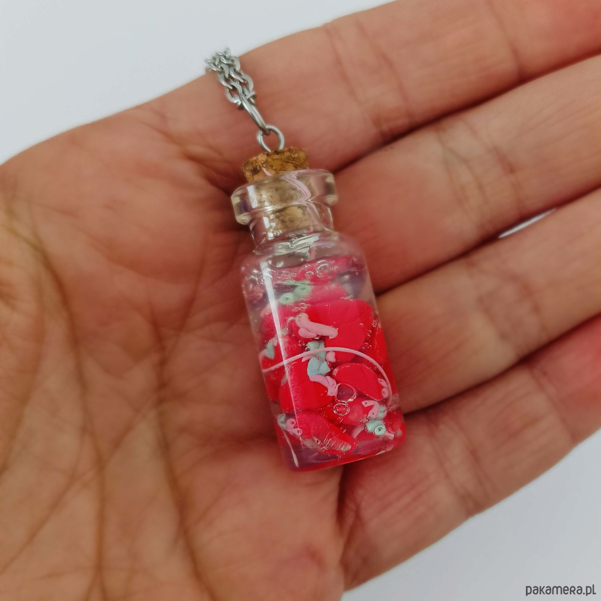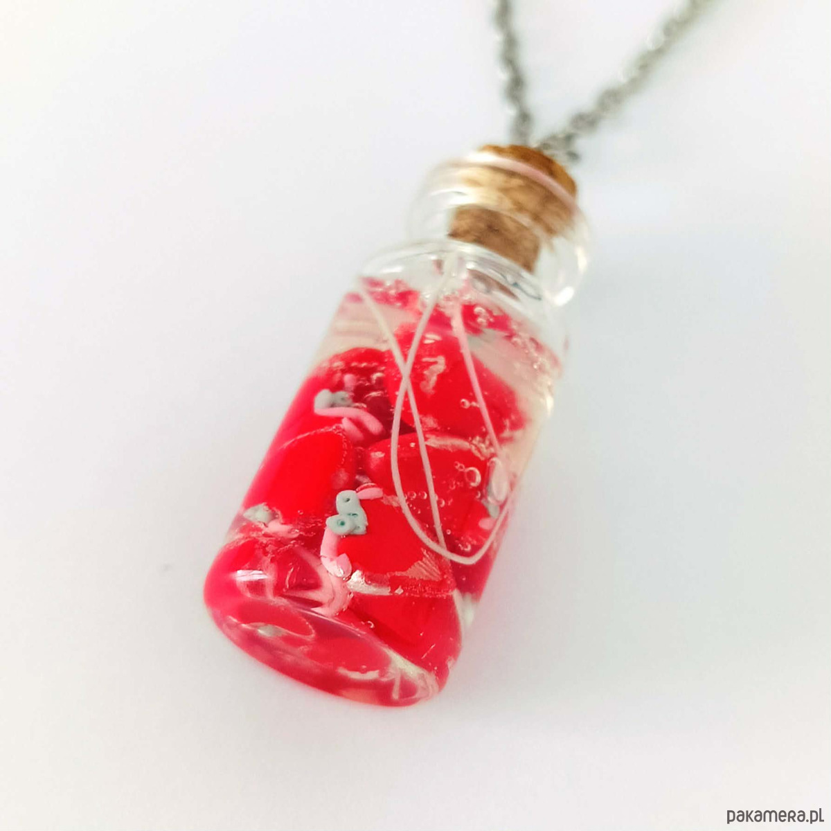 Autorski naszyjnik z miniaturową szklaną buteleczką zamkniętą korkiem, wypełnioną czerwonymi serduszkami. Każdy element został ręcznie wykonany z masy polimerowej i starannie umieszczony w fiolce, tworząc formę przypominającą mały, symboliczny „eksponat”.