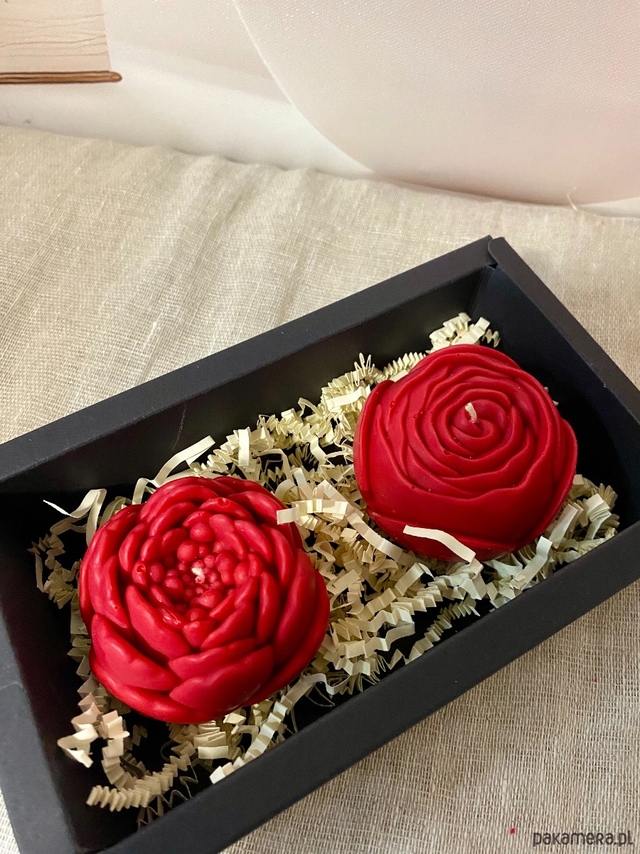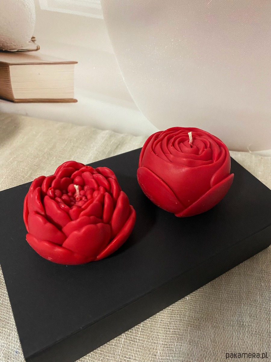 Elegancki zestaw dwóch ręcznie wykonanych świec w kształcie rozkwitających kwiatów, to wyjątkowa dekoracja, która wprowadzi do wnętrza ciepło i romantyczny nastrój. Intensywna czerwień symbolizuje miłość, dzięki czemu świece doskonale sprawdzą się jako ozdoba salonu, sypialni lub stołu podczas wyjątkowych okazji.