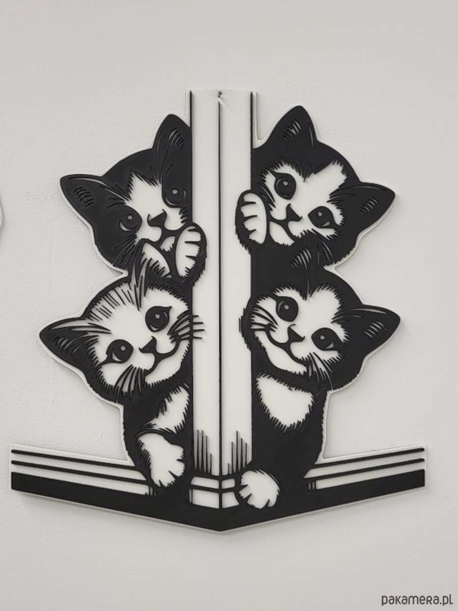 Wprowadź odrobinę uroku i elegancji do swojego wnętrza dzięki wyjątkowemu obrazowi 3D przedstawiającemu urocze koty schowane za nogą stołu. Wykonany z najwyższą precyzją przy użyciu nowoczesnej technologii druku 3D, ten czarno-biały obraz zachwyca detalem i kontrastem.