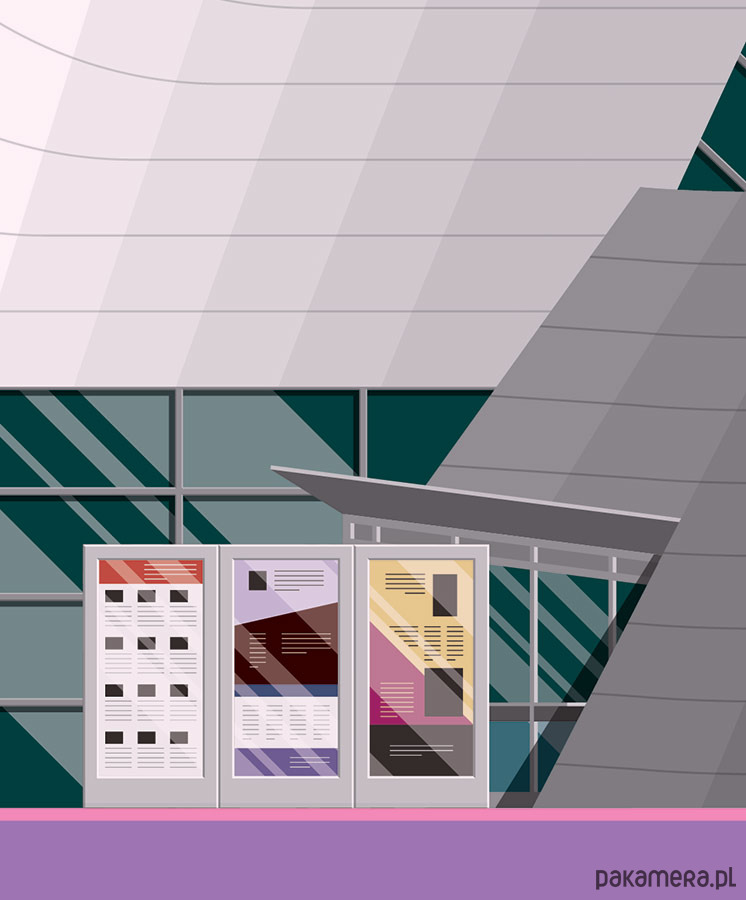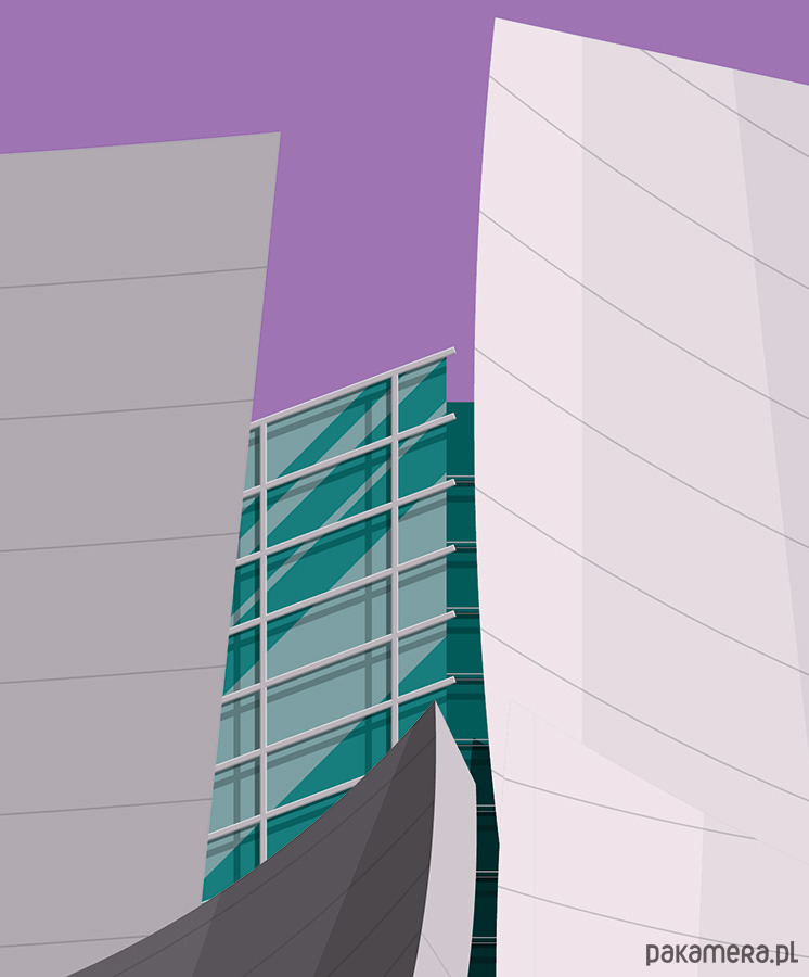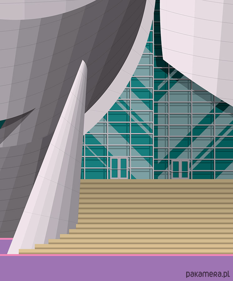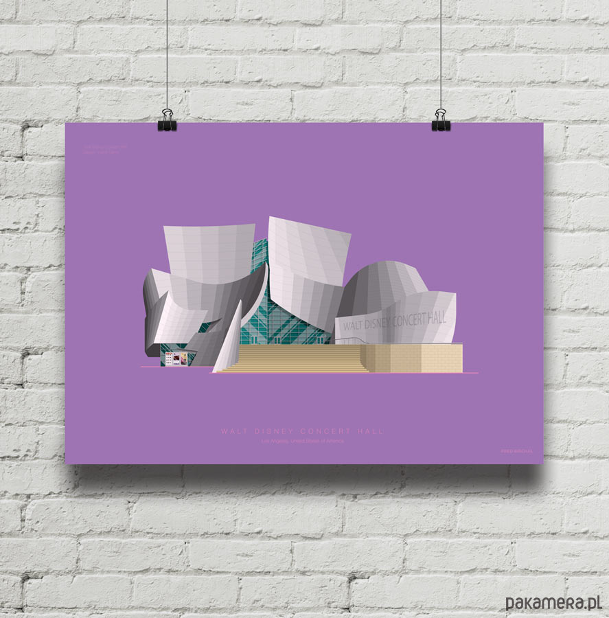 Plakat z autorską grafiką inspirowany Walt Disney Concert Hall w Los Angeles. Pochodzi z serii "Dookoła Świata" i przedstawia halę koncertową, będącą jednym z symboli miasta. Budynek zaprojektowany został przez Franka Gehry'ego.