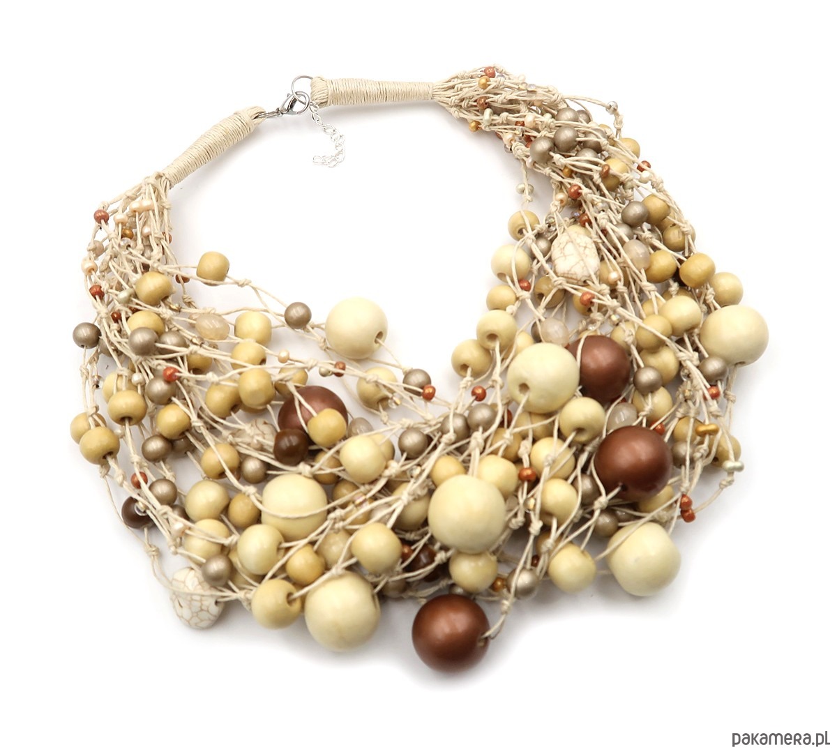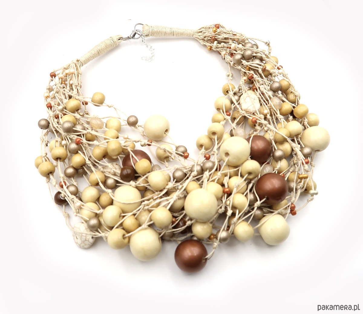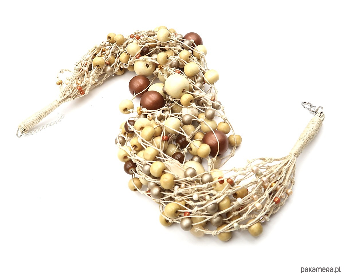 Unikatowy, ręcznie wykonany naszyjnik stworzony na naturalnej, polskiej przędzy lnianej w odcieniu subtelnej wanilii. Kompozycja utrzymana jest w harmonijnej palecie beżu, kremu oraz piaskowej bieli, z akcentami w kolorze arachidowego brązu, co nadaje biżuterii ciepły, organiczny charakter.
