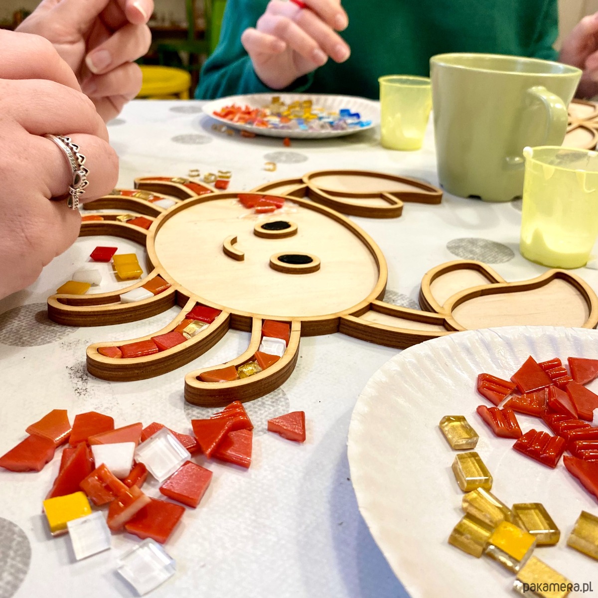 Cena obejmuje 1 wybraną formę do wykonania mozaiki, wszystkie niezbędne materiały do pracy, w tym różne kolory mozaiki oraz prowadzenie warsztatów.