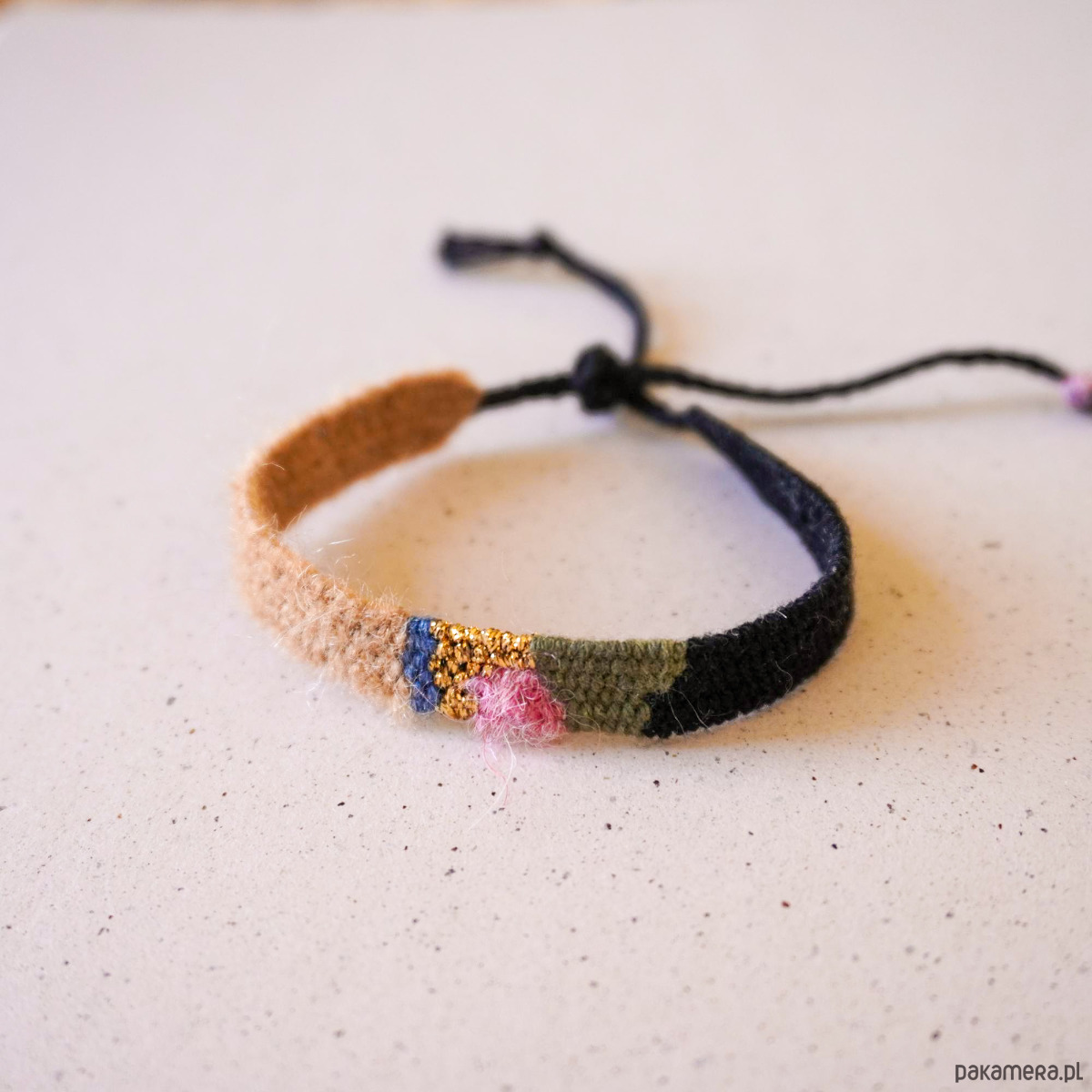 Wąska bransoletka ręcznie robiona na krośnie, wiązana na supełek