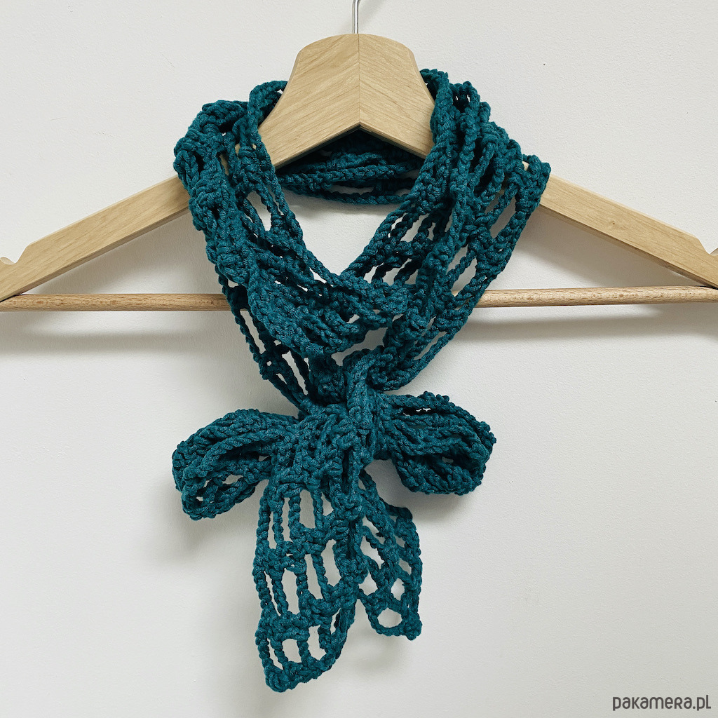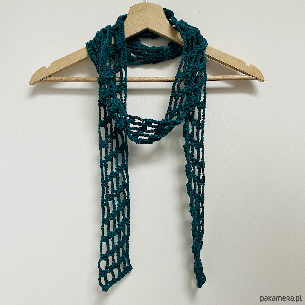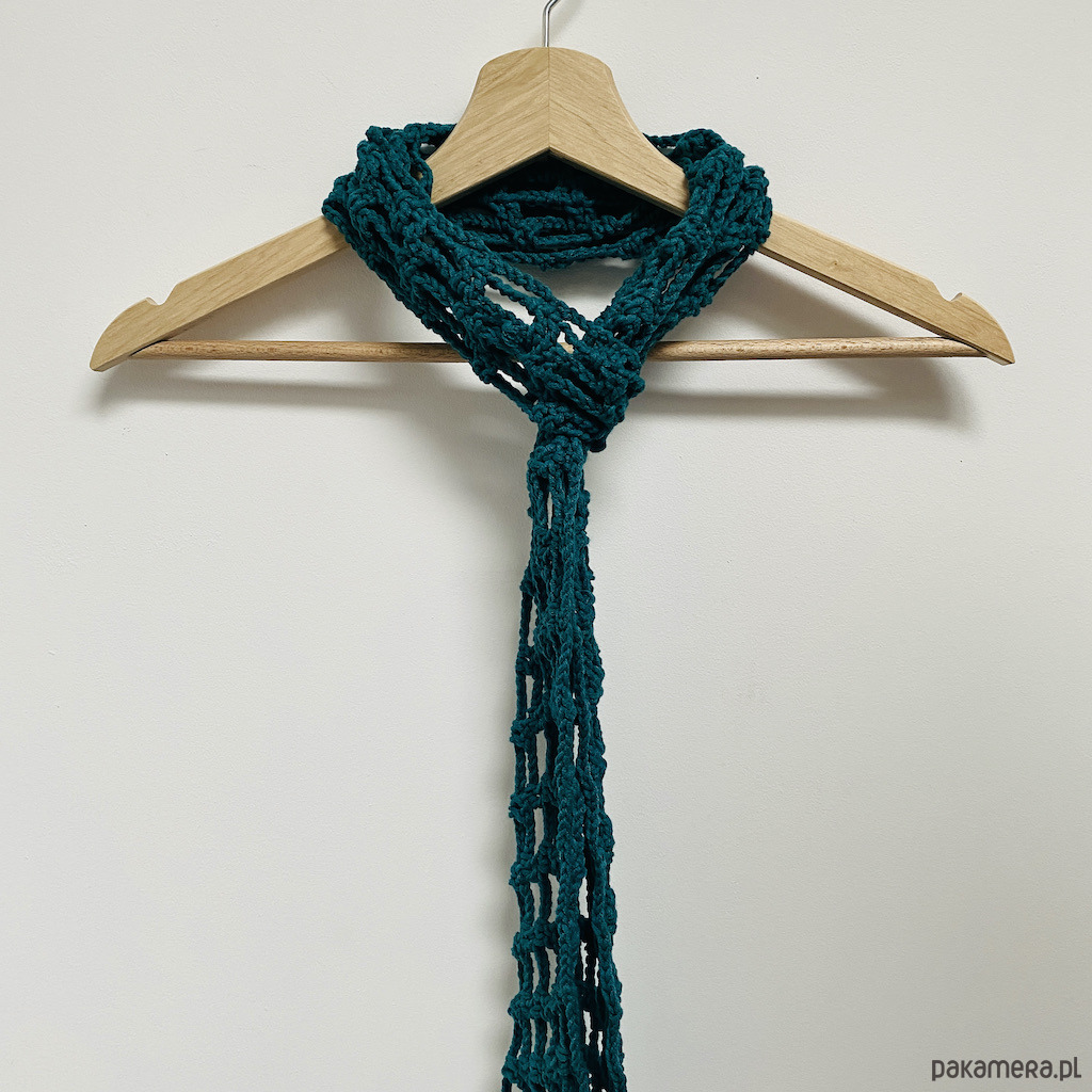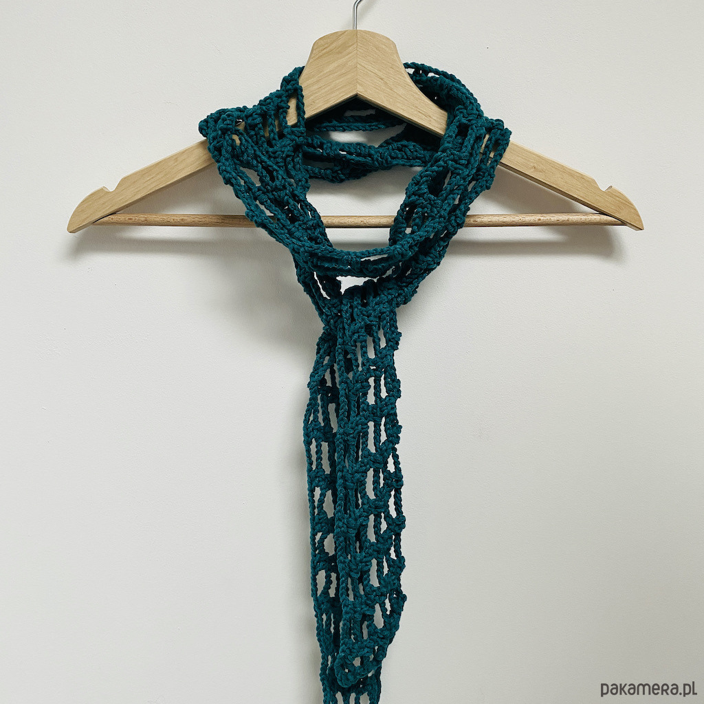 Ażurowy, siatkowy wzór nadaje mu ciekawego charakteru, a odpowiednia długość pozwala na różne sposoby stylizacji – możesz owinąć go wokół szyi, nosić jak naszyjnik, opaskę lub delikatny akcent do letnich i jesiennych stylizacji.
