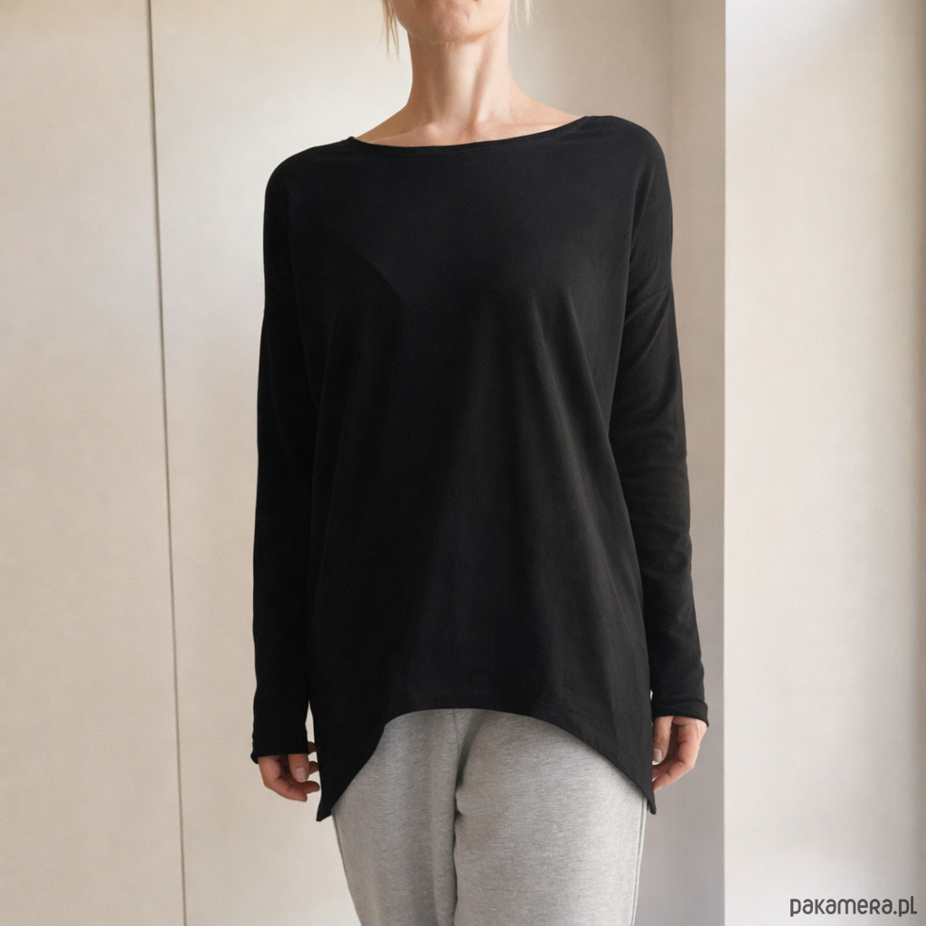 Czarna bluzka z wąskimi rękawami, po bokach szerokie "skrzydła."