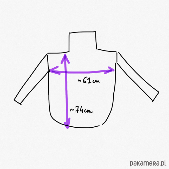 Szerokość pod pachami ok.: 61cm, długość ok. 74cm.