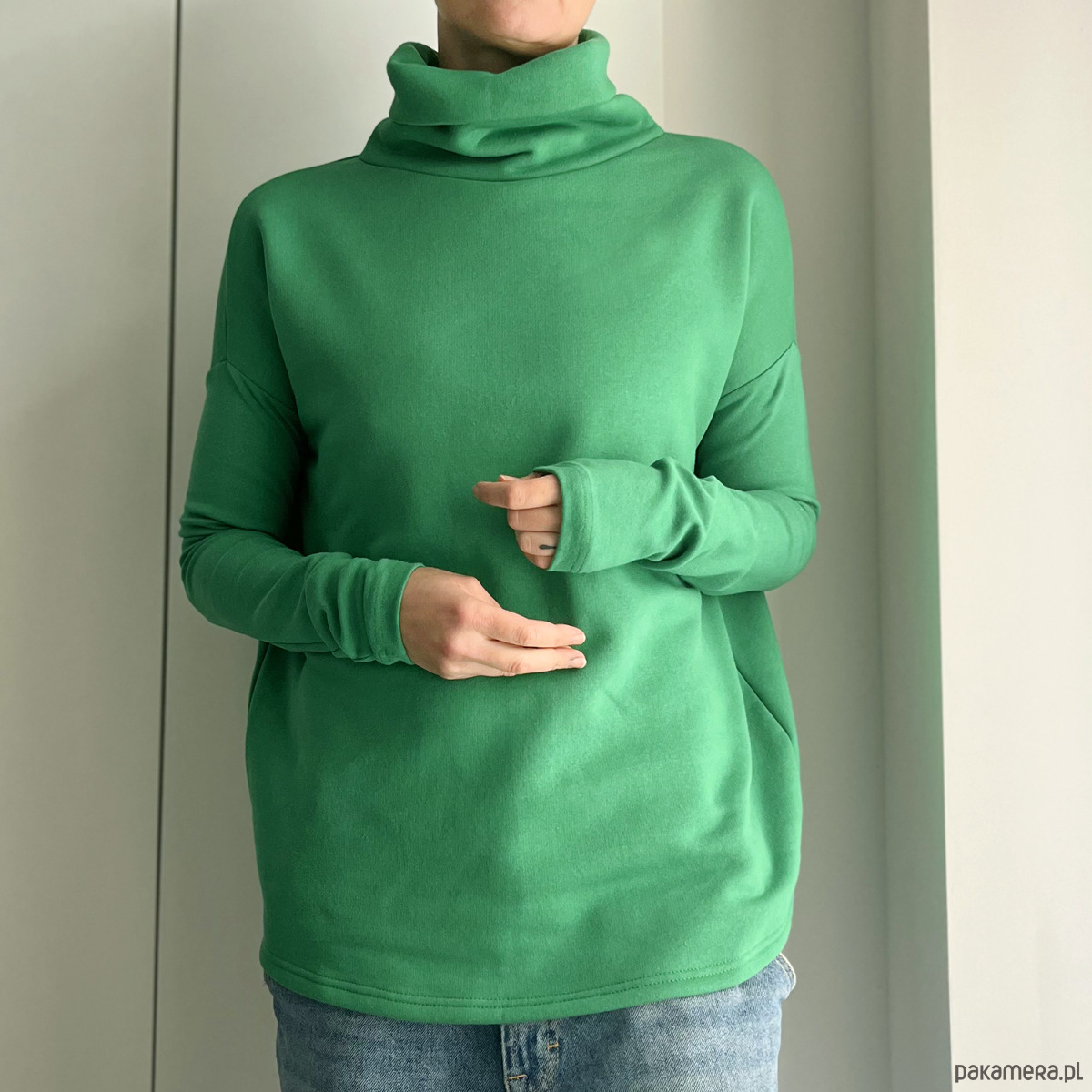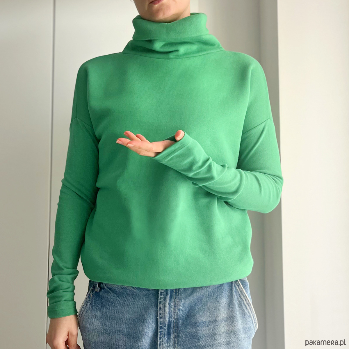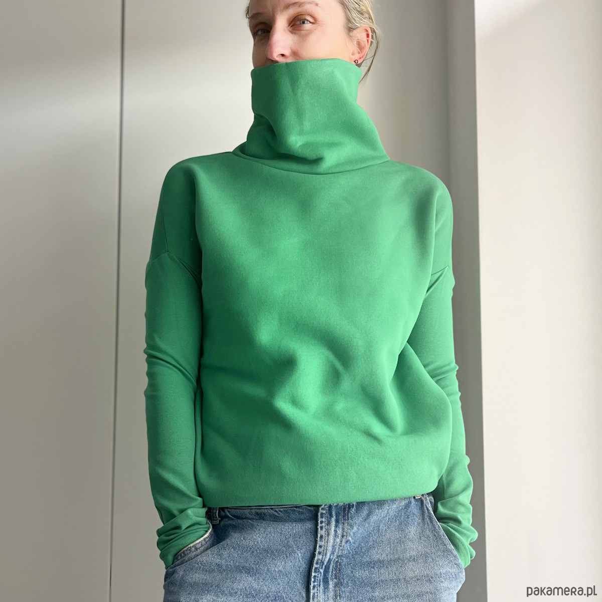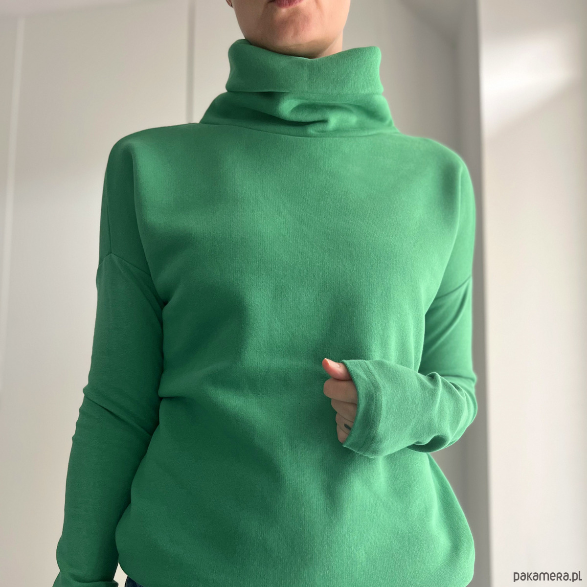 Ta ma wszystko, czego trzeba: grubą dresówkę, długie wąskie rękawy i wysoki, podwójny golf, w który można się schować po same uszy.