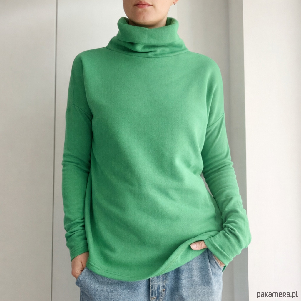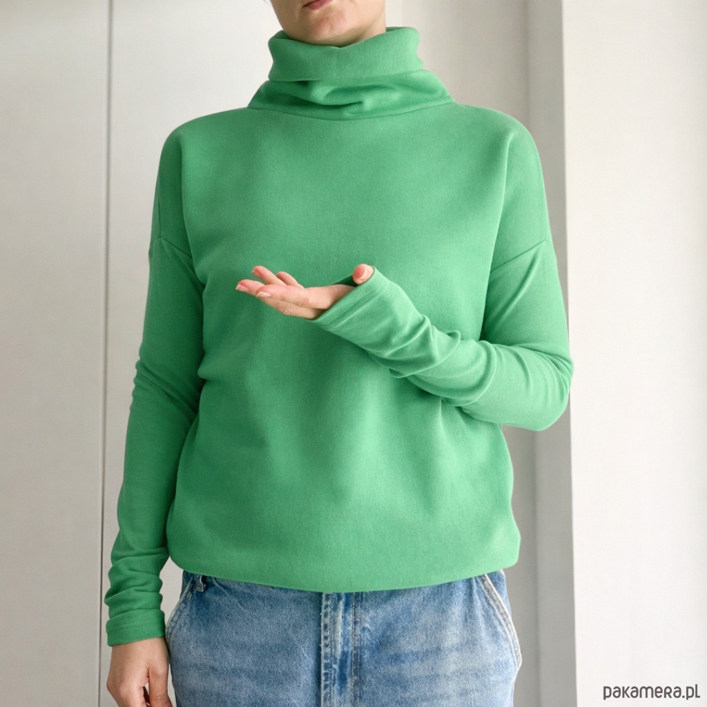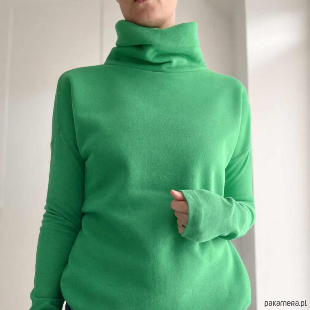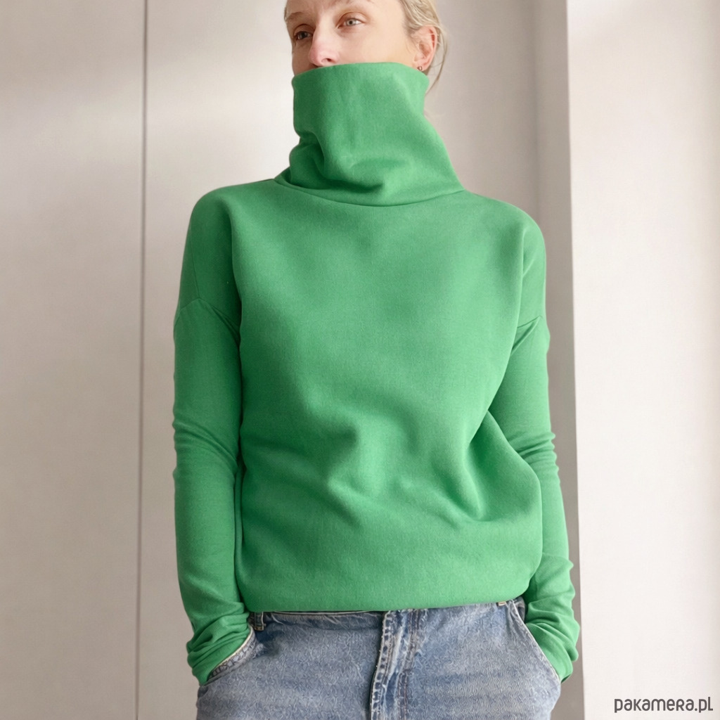 Ta ma wszystko, czego trzeba: grubą dresówkę, długie wąskie rękawy i wysoki, podwójny golf, w który można się schować po same uszy.