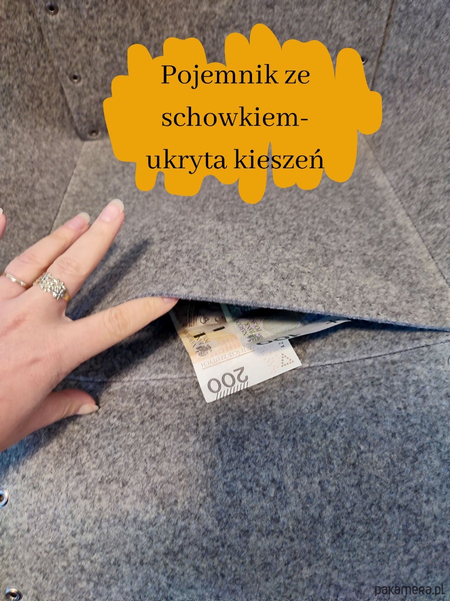 Pudełko ma ukrytą kieszeń umieszczoną od wewnętrznej strony na dnie. Można wsunąć swoje kosztowności i przykryć rzeczami. Kieszeni nie widać z zewnątrz - jest ukryta.