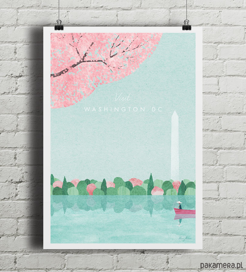 Plakat w stylu vintage przedstawiający panoramę Waszyngtonu. Na pierwszym planie dziewczyna w czerwonej łodzi płynie przez jezioro otoczone kwitnącymi wiśniami. Na drugim planie bujne drzewa odbijają się w spokojnej tafli jeziora, a zza nich wyłania się ikoniczny biały obelisk - Pomnik Waszyngtona. Inspirowany plakatami podróżniczymi z lat 20-tych XX wieku.