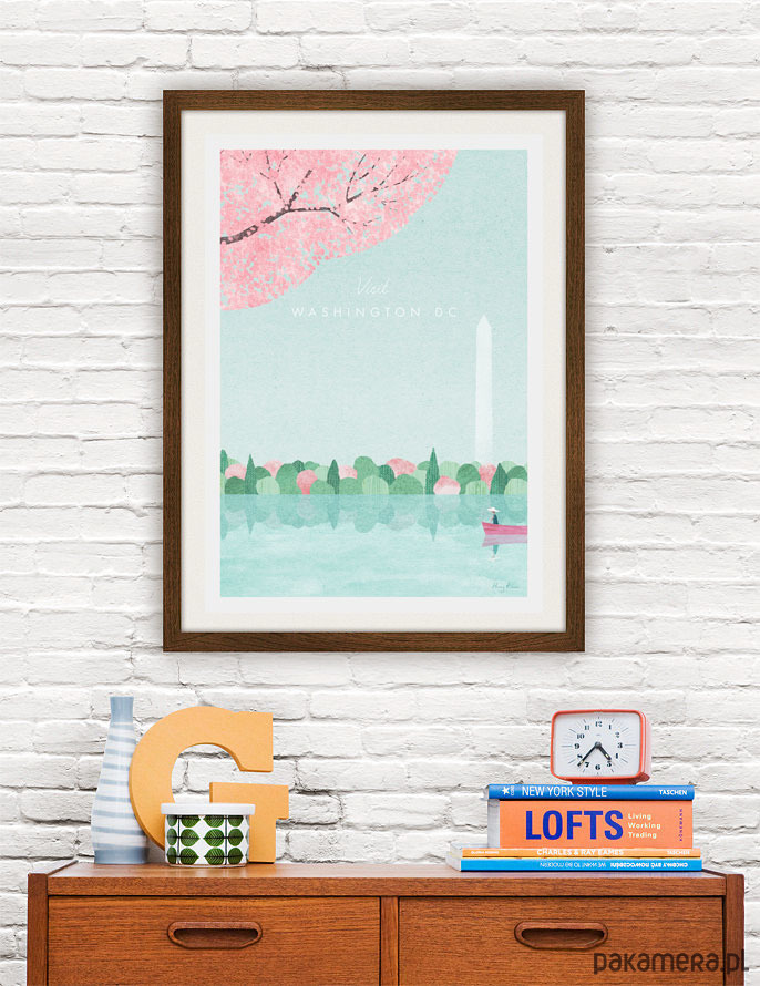 Plakat w stylu vintage przedstawiający panoramę Waszyngtonu. Na pierwszym planie dziewczyna w czerwonej łodzi płynie przez jezioro otoczone kwitnącymi wiśniami. Na drugim planie bujne drzewa odbijają się w spokojnej tafli jeziora, a zza nich wyłania się ikoniczny biały obelisk - Pomnik Waszyngtona. Inspirowany plakatami podróżniczymi z lat 20-tych XX wieku.