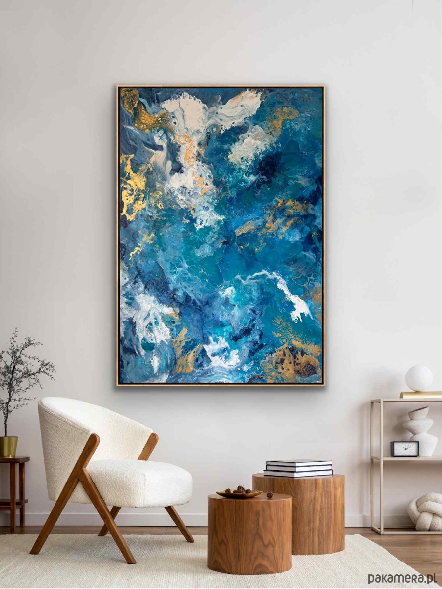 Ten obraz robi bardzo silne wrażenie swoją energią i intensywnością barw. Dominujące odcienie błękitu i turkusu przywołują skojarzenia z bezkresnym oceanem – dynamicznym, pełnym ruchu, a zarazem tajemniczym. Białe i złote akcenty wprowadzają światło, dzięki czemu kompozycja zyskuje wymiar lekkości i blasku.