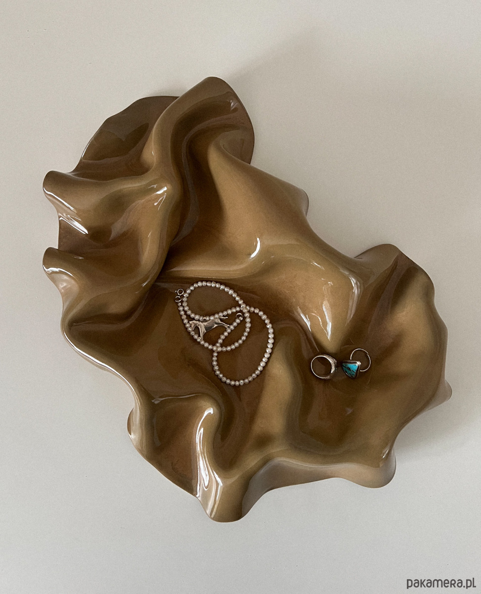 Rzeźbiarska taca o organicznej, falującej formie, która balansuje między funkcją a obiektem artystycznym. Każde załamanie i miękka linia zostały uformowane ręcznie, dzięki czemu każda sztuka jest unikatowa.
