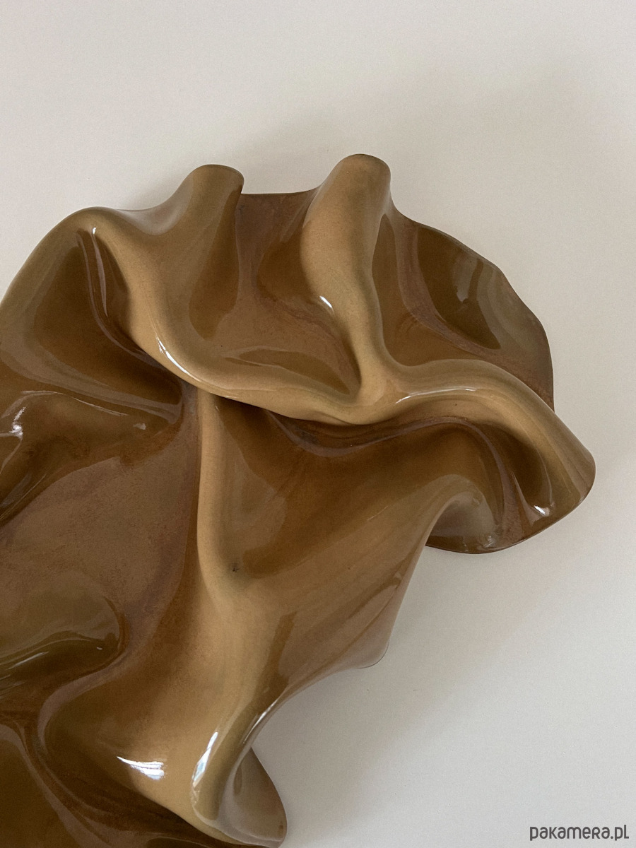 Wykonana z kamionki i wypalana w wysokiej temperaturze, co zapewnia trwałość oraz subtelnie szklistą, głęboką powierzchnię w odcieniach ciepłego brązu. Naturalne przejścia kolorystyczne i refleksy światła podkreślają jej dynamiczny charakter.