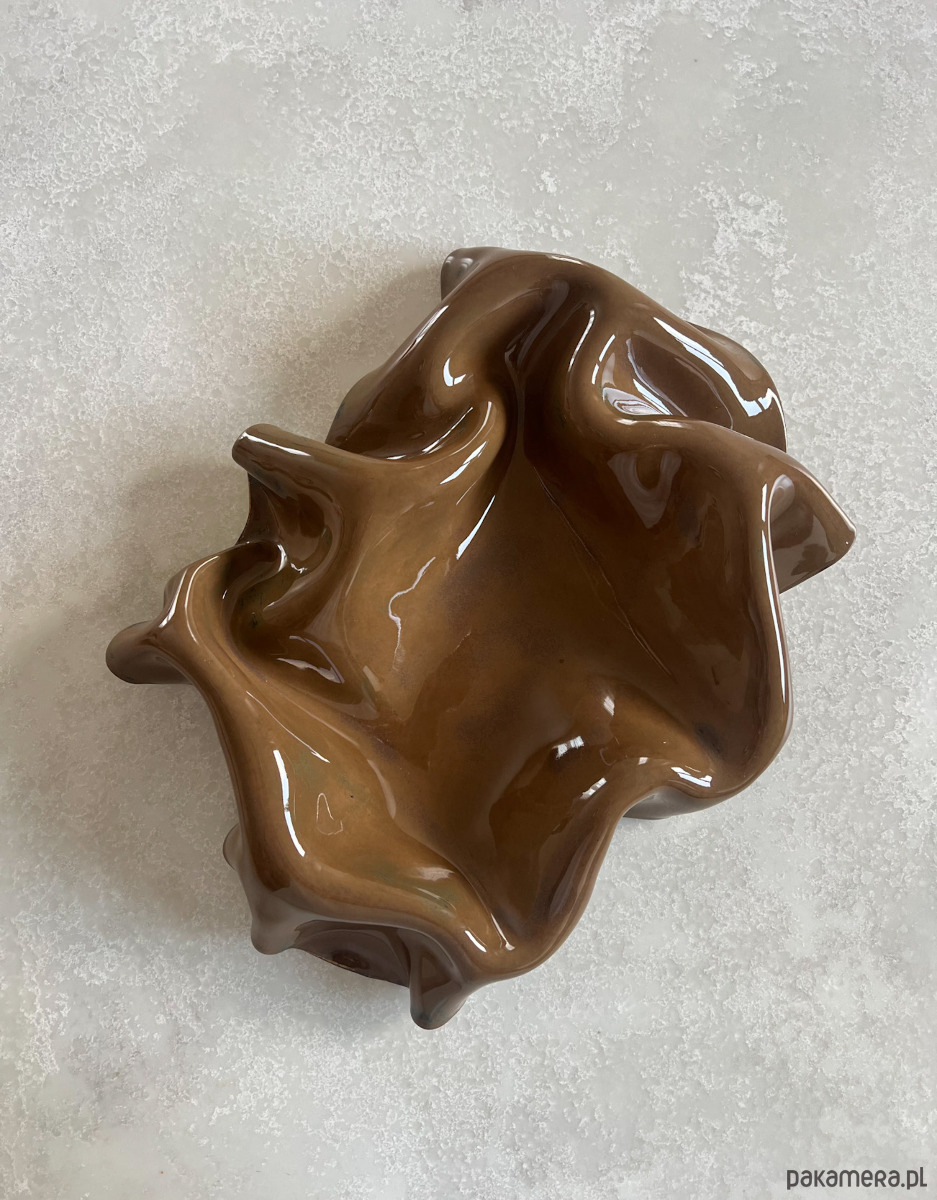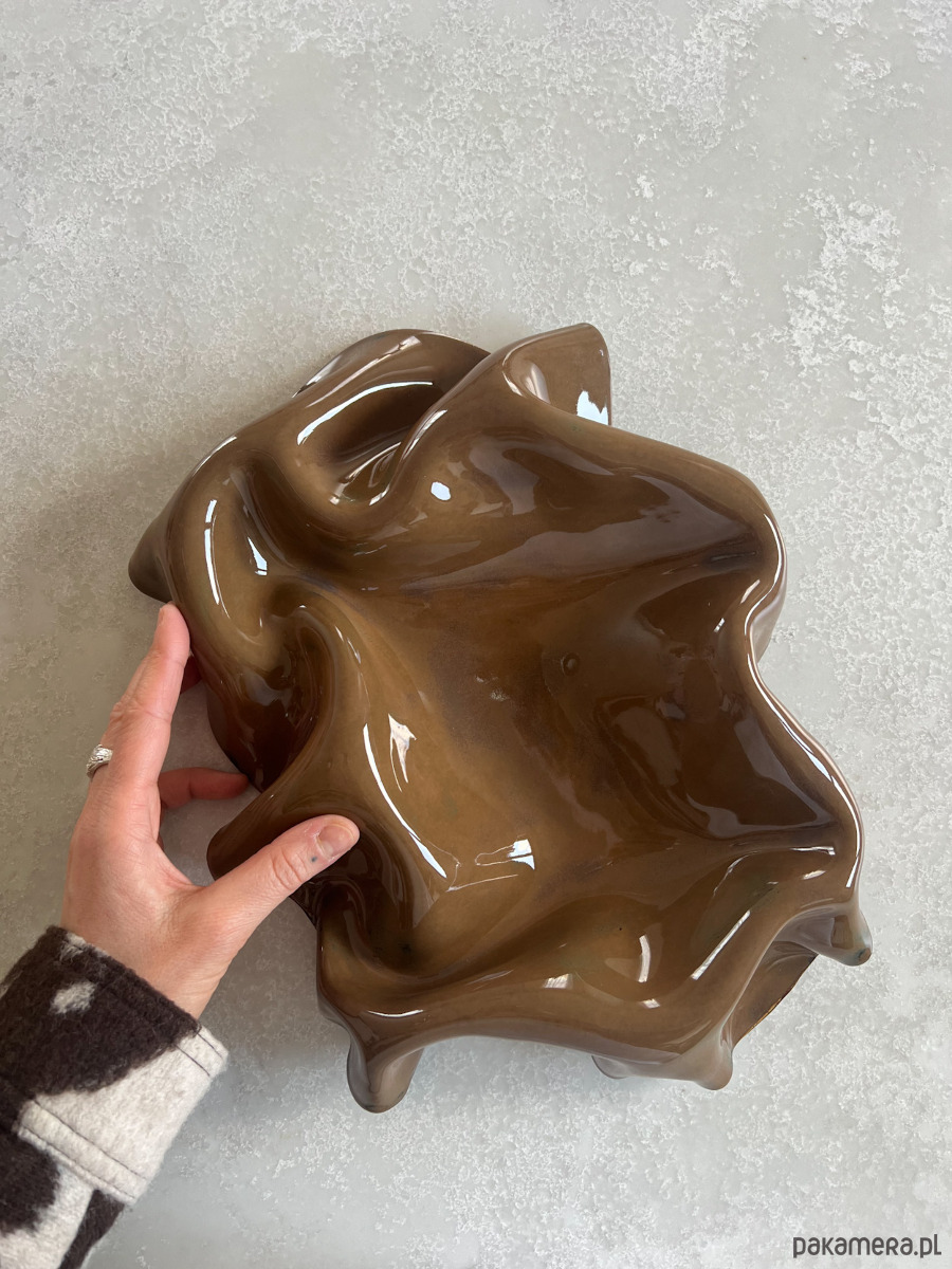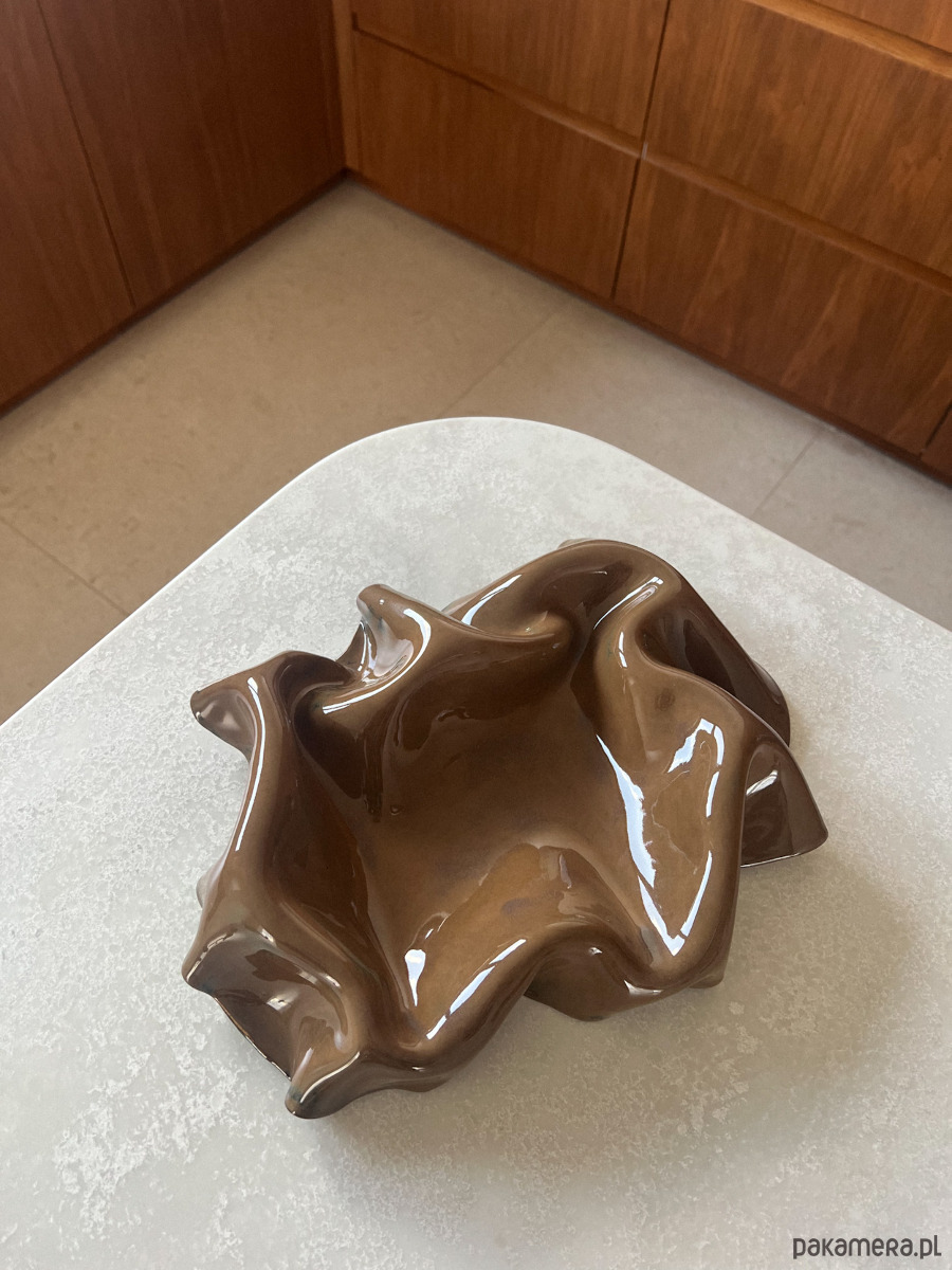 Wykonana z kamionki i wypalana w wysokiej temperaturze, co zapewnia trwałość oraz subtelnie szklistą, głęboką powierzchnię w odcieniach ciemnego brązu. Naturalne przejścia kolorystyczne i refleksy światła podkreślają jej dynamiczny charakter.