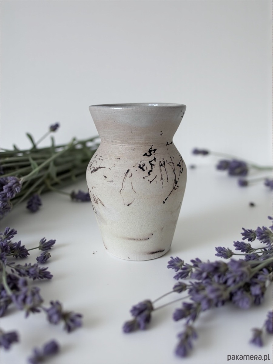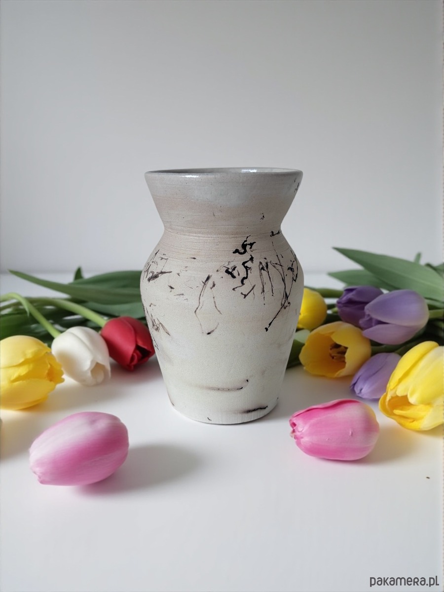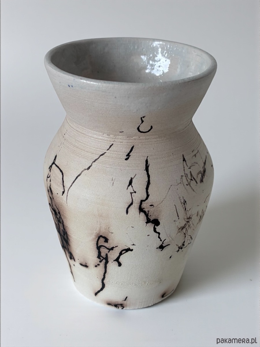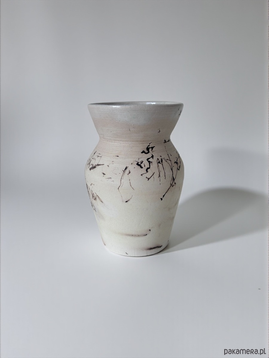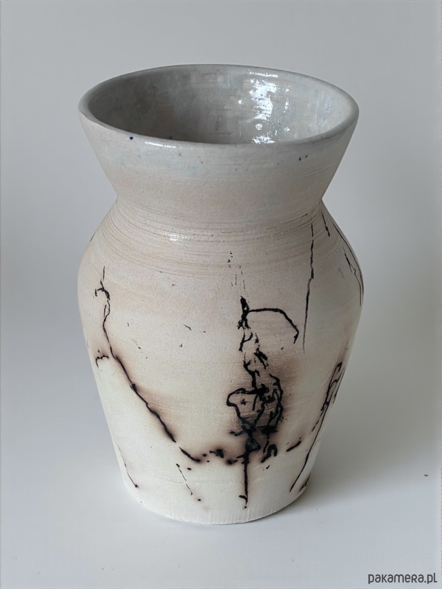Wykonany ręcznie, toczony na kole z jasnej gliny w kolorze białym. Kształt wazonu nawiązuje do klasycznych form, dzięki czemu to idealny element dekoracyjny do salonu, sypialni lub jadalni. Jego organiczne , nieregularne czarne wzory powstały w wyniku japońskiej techniki wypału "raku", co nadaje mu unikalny charakter i wyjątkową estetykę. Każdy szczegół tego wazonu odzwierciedla spontaniczne efekty spękań i przebarwień ,a jego odcienie bieli i czerni sprawiają, że wazon doskonale komponuje się z wnętrzem w stylu minimalistycznym czy "japandi", nadając mu subtelną atmosferę.